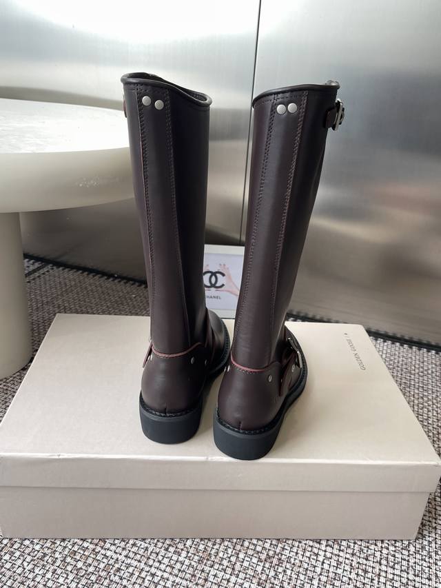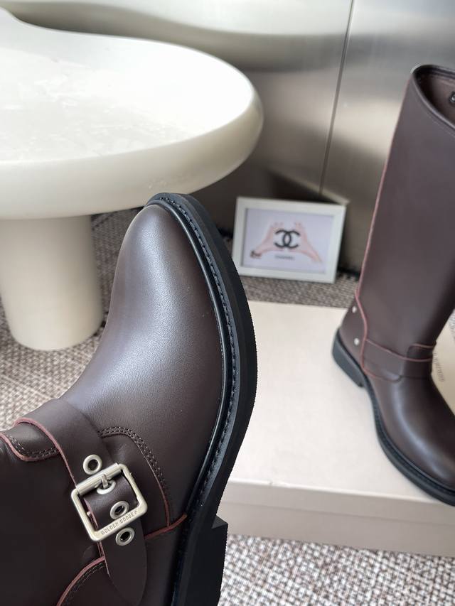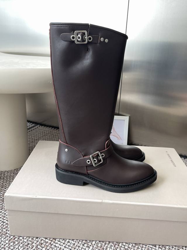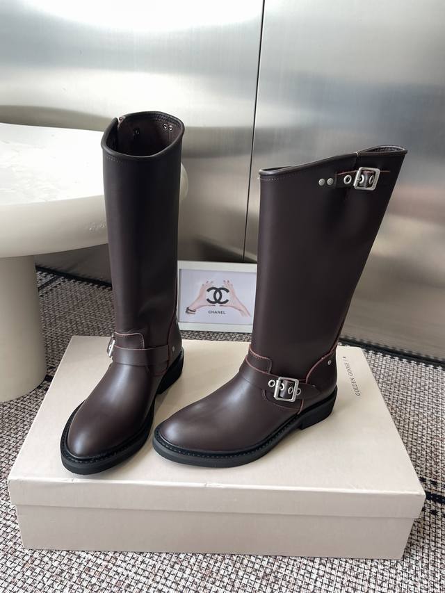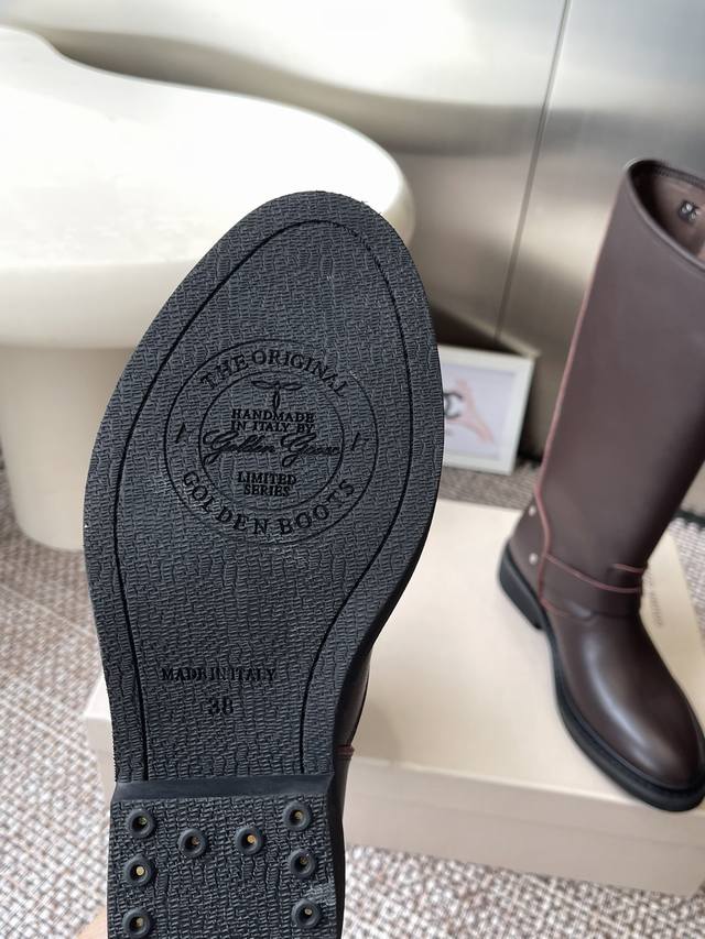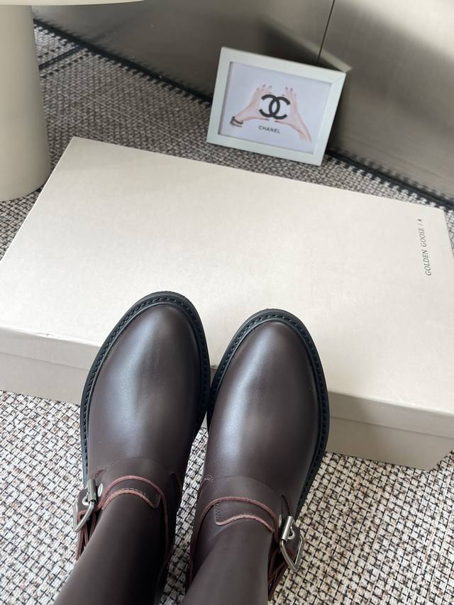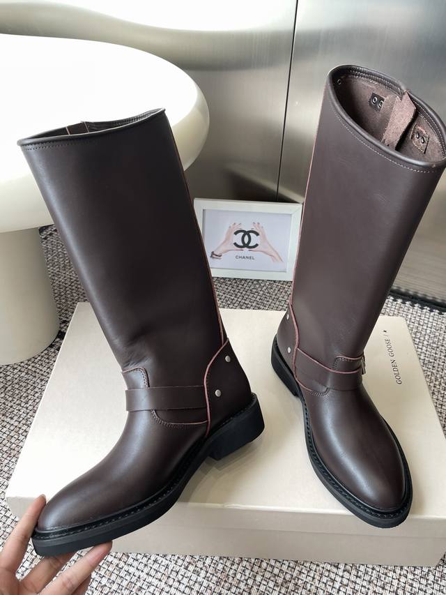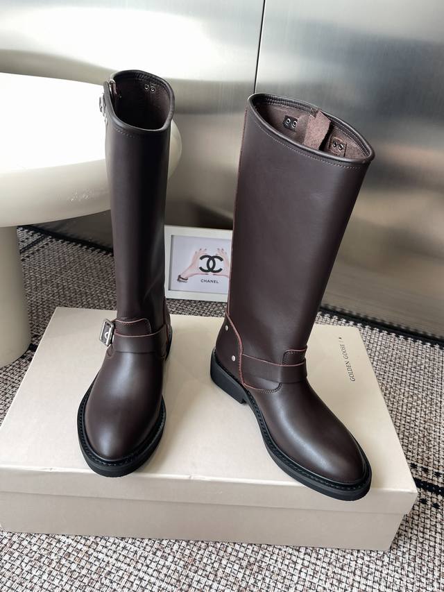 Ggdb Golden Goose 25Ss秋冬新款 复古长筒靴骑士靴 采用优质真皮制作 质感细腻且耐用 能呈现出良好的光泽感 属于高筒骑士靴款式 鞋身带有金属扣饰元素 增添了复古与酷感风格 鞋型利落 靴筒高度适中 对腿部线条有较好的修饰作用 搭配黑色皮夹克 黑色紧身裤 再配上金属质感的配饰 打造出机车风的酷帅造型 深棕色款可搭配格纹西装 高腰直筒牛仔裤 营造出复古摩登的氛围 鞋面进口头层小牛皮 内里牛皮 原版开模橡胶底+真皮沿条组合大底 码数:35-40 40定做不退换
