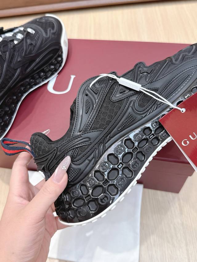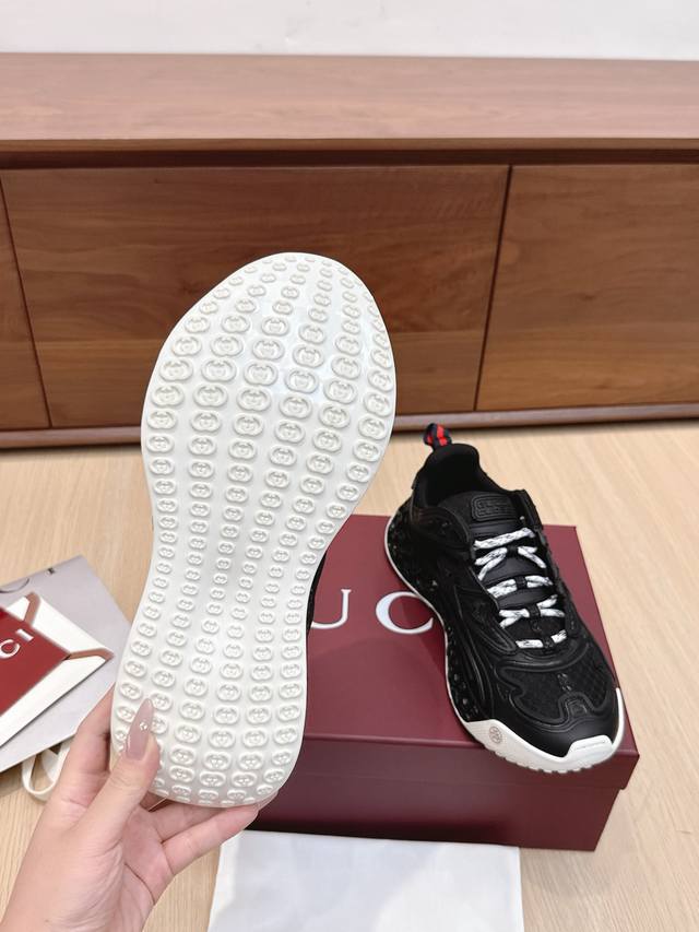 原版购入开发 做货 2025春夏系列精彩呈献鞋履新作。这款Gucci Cub3D系列运动鞋巧妙结合了创新材质与精致构型。鞋面采用可持续材料Demetra与网眼面料,细节之处经由高频工艺匠心呈现。鞋底内部填充Eva材料,外部采用Tpu打造,最后以3D效果互扣式双G图案点睛,为款型平添风采
