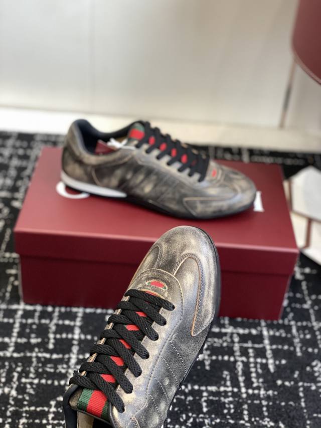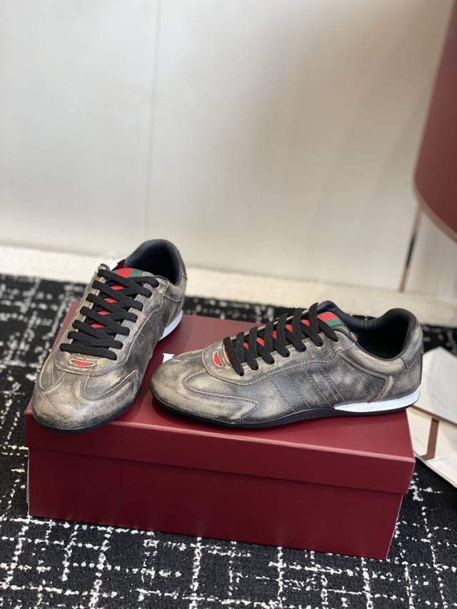 代购级 Gucci Shift2026走秀款系列情侣款德训薄底 运动鞋 Gucci Shift系列全新上市,轻盈设计焕新诠释运动风尚。利落廓形更添自在本色,行动间彰显精致质感。织带细节宛如一道延绵不绝的饰带贯穿于整个设计,侧边缝线细节增添点睛之笔。 原版一比一开发 水洗效果牛皮鞋面 双色Tpu大底 Size:35-45 45定做不退换