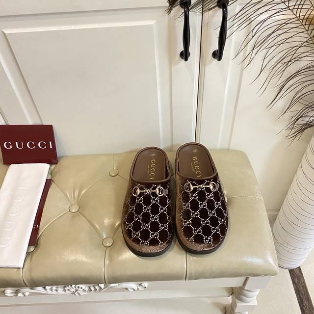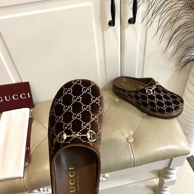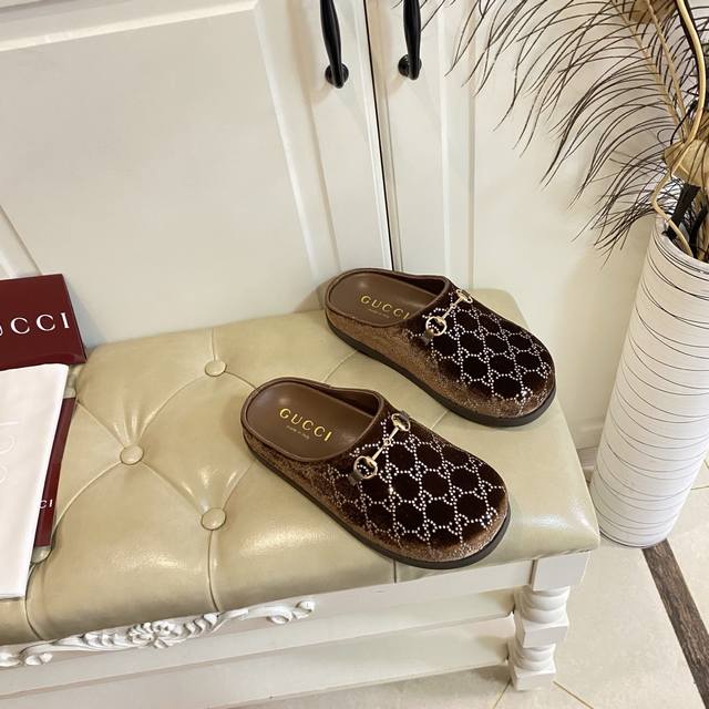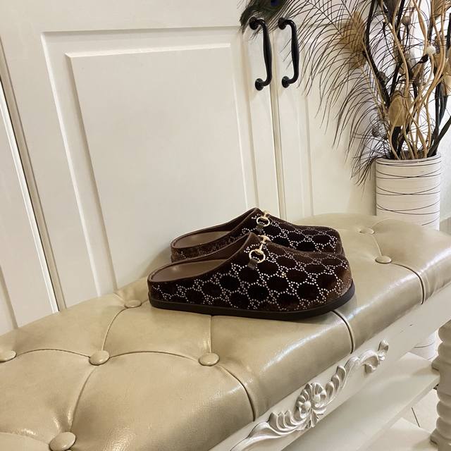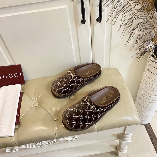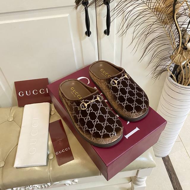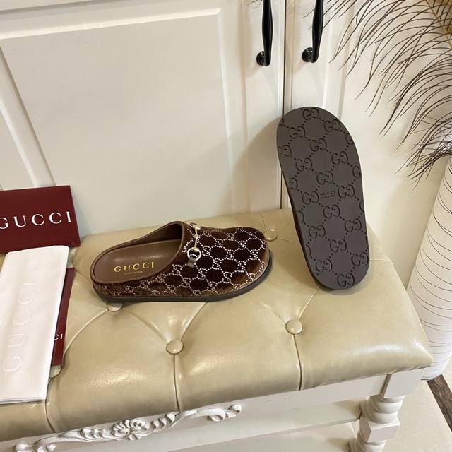 出厂价P ,古奇Gucci新款包头拖鞋,水晶丝绒双G钻面,羊皮里,橡胶底,36-42码 DDD
