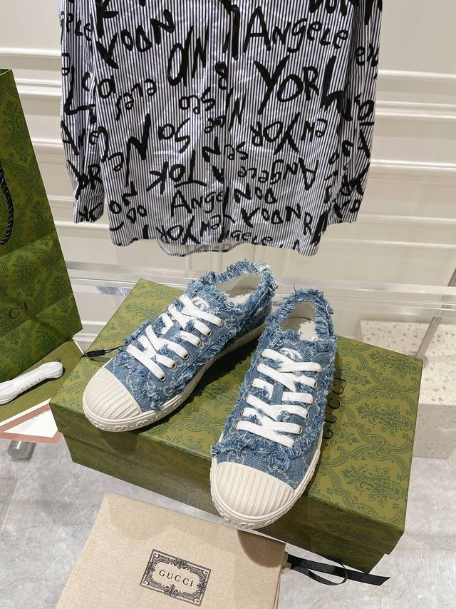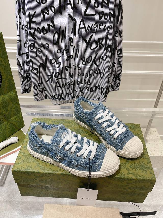 / 出厂 Gucci 224 早春新款牛仔蓝帆布鞋情侣款春夏搭配神器,轻盈又舒适 面料:进口流苏G布。 大底: 原版开模Tpu 内里:进口帆布 底厚:2Cm 码数: