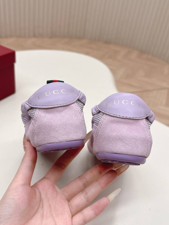 Gucci古驰橡筋鞋超级轻盈柔软到可以卷起来的一双跳舞鞋。米白色色牛反绒面+Gg布,精心缀饰Gg五金扣。轻盈质感与闪耀外观兼具...