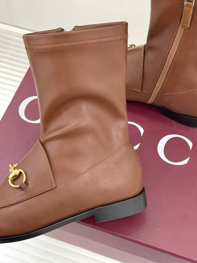 厂价 DDD Gucci 古驰经典双G马衔扣复古乐福 DDD 弹力靴短靴 DDD 当百年马术基因邂逅现代穿着哲学 DDD 这款弹力靴便有了跨越时光的魅力 DDD 标志性马衔扣以浅金色调雕琢 DDD 既是品牌起源的优雅注脚 DDD 也为鞋身注入低调贵气 DDD 呼应着马术运动的经典与力量 。 DDD 鞋面甄选柔韧弹力皮革 DDD 随双足曲线灵活贴合 DDD 靴口的松紧镶饰消解了束缚感 DDD 让穿脱与行走都成为自在享受 。 DDD 延续乐福鞋的复古轮廓 DDD 搭配利落短靴版型 DDD 皮革鞋底承载着意大利