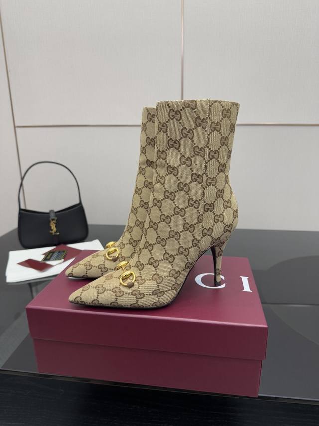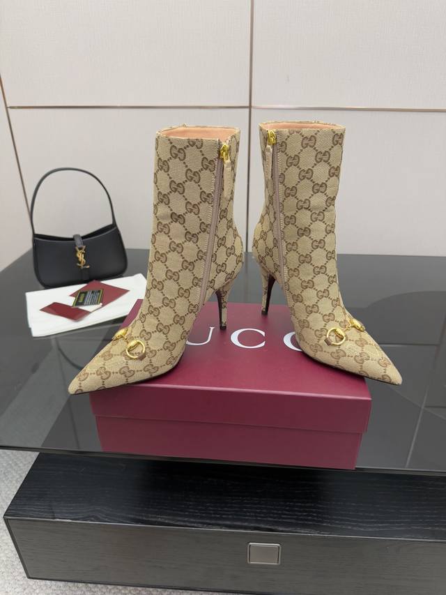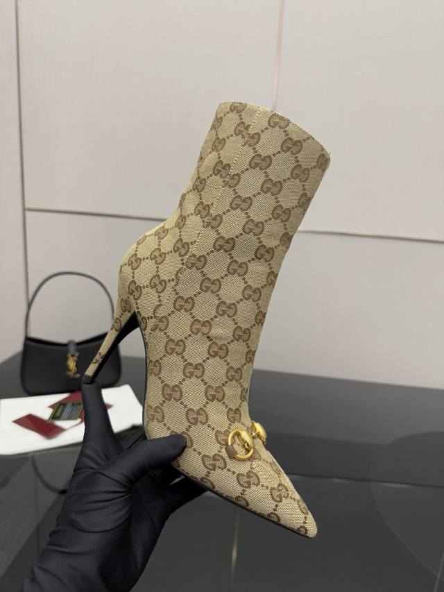 / 厂价p布面 Gucci 经典爆款秋冬尖头链条高跟短靴! 今年最不能错过的一双靴子!整体楦型流畅秀气,精致百搭又不失时髦感谁还没有冲啊 面料采用进口小牛皮,布料