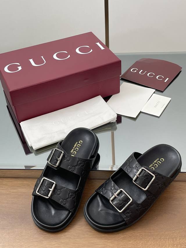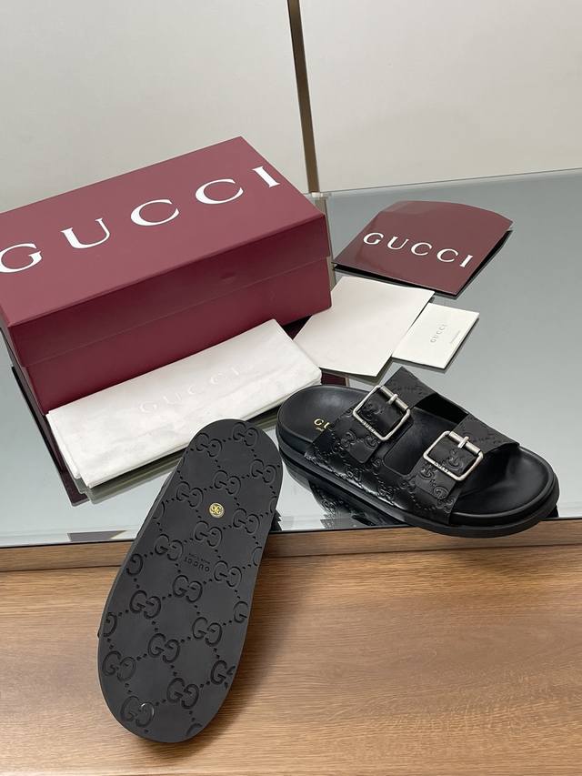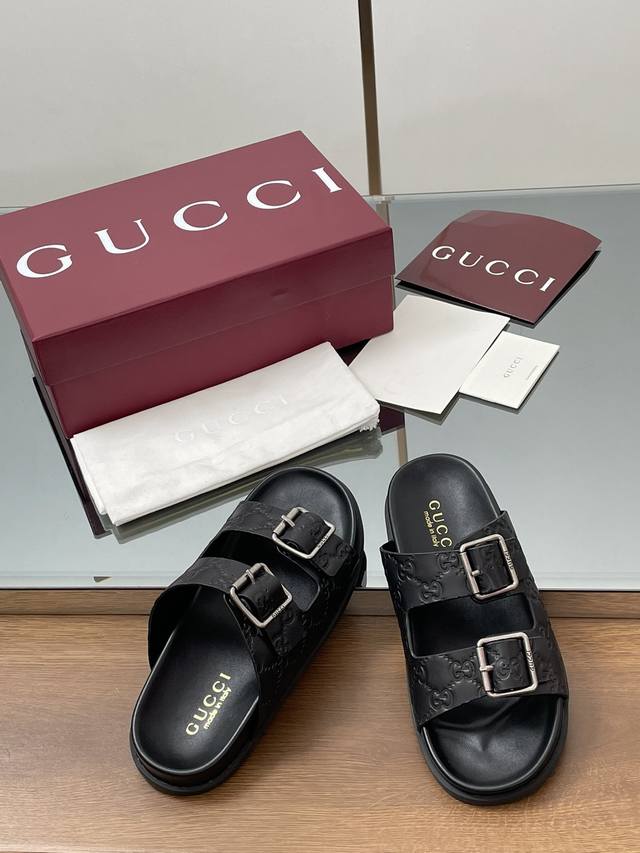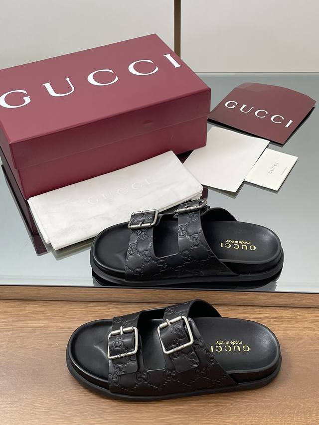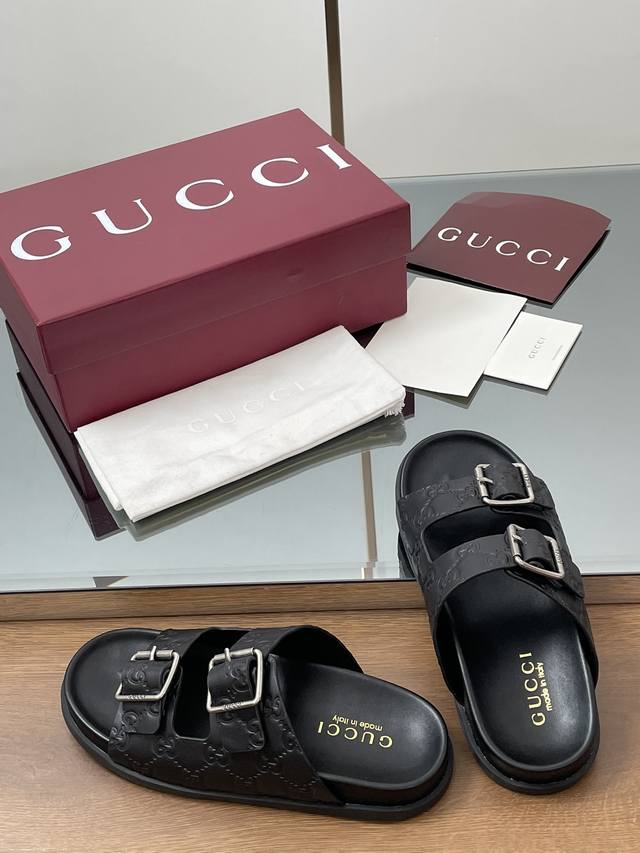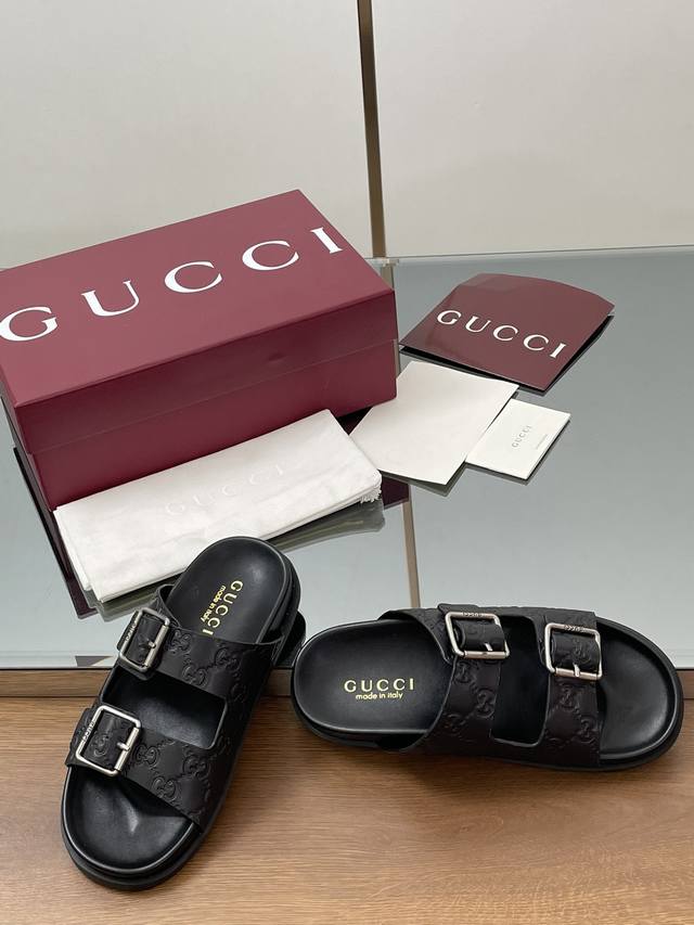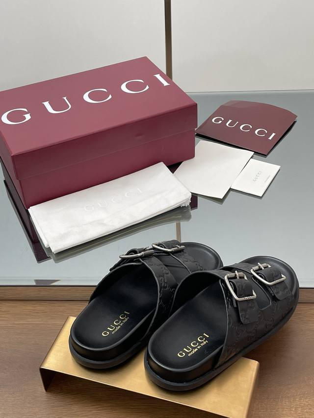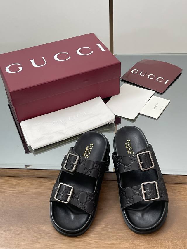 夏季新款Gucci高端精品 古驰早春系列饰双排皮带搭扣沙滩凉鞋轻便套脚休闲拖鞋顶级代购品质!原版1:1复刻,毎个细节皆经过精心打磨细腻制作.可与Zg对比如一,无二品质! Gucci 现代设计美学探索独特匠心之路,巧妙融合品牌经典元素与备受喜爱的品牌标识。这款凉鞋缀饰备受喜爱的双G G迷你压纹材质+双排皮带扣造型配件,为整个设计注入一抹低调的品牌标识魅力面料:原版定制进口Gg压纹牛皮内里 垫脚:水染牛皮里鞋跟:平跟薄底大底:G G模具进口橡胶底尺码:女35-41 4041定做不退换 包装:全套安可拉酒红原包