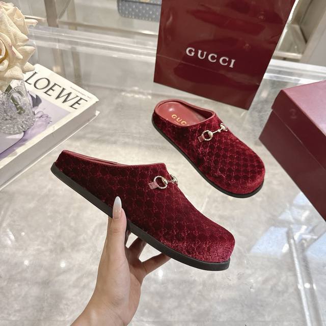 女性穆勒鞋天鹅绒面配马衔扣 古驰继续在2025年早秋系列中融入历史符号。Horsebit五金件让人想起品牌的马术传统,出现在这双穆勒鞋之上。 酒红色 Gg天鹅绒 浅金色调的五金配件 马衔扣 圆头 橡胶鞋底 平底 意大利制造 码数:36~42码