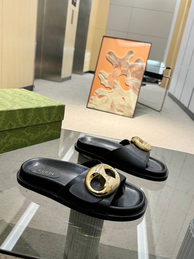 工厂P价 P340 Gucc*家2新款平跟一字拖 高版本 长期做货 推荐给美眉们 一定要试试这款拖鞋 又一款心头爱 ~版型超正 做工细节完美 ,上脚非常舒适 高雅百搭。原版开模 不是市场的普通版本 意大利真皮大底!