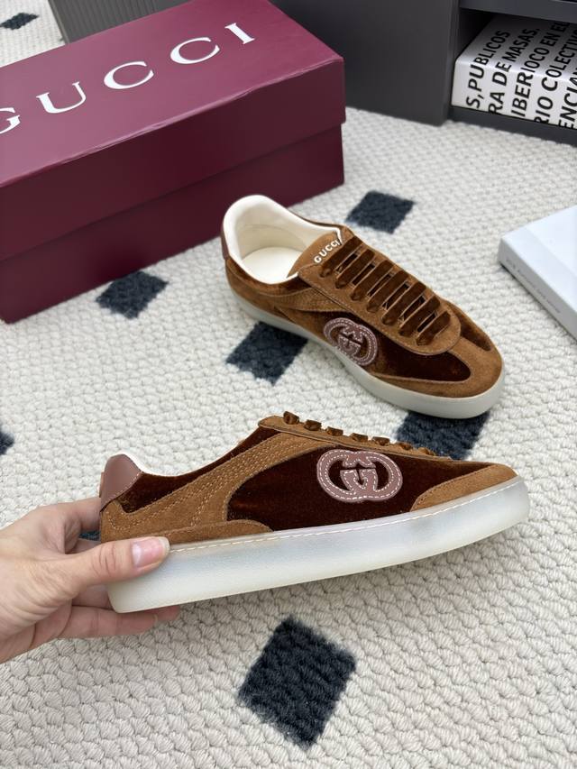 情侣款 2025新款Gucci 德训鞋原版一比一打造舒适度、包裹性都比较好。个性十足,很好驾驭各种风格衣服搭配。 面料:牛皮、牛反绒、 内里:牛皮。 大底:原版Tpu大底, 码数:女35-40 男39–44 配原版全包装