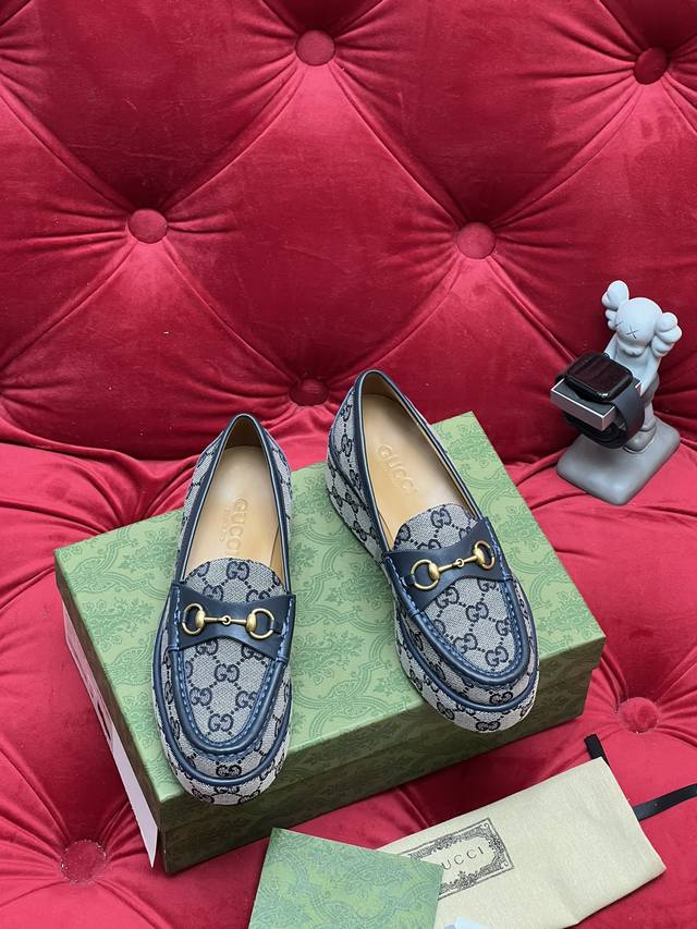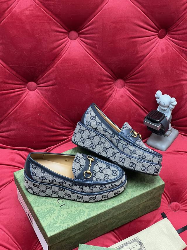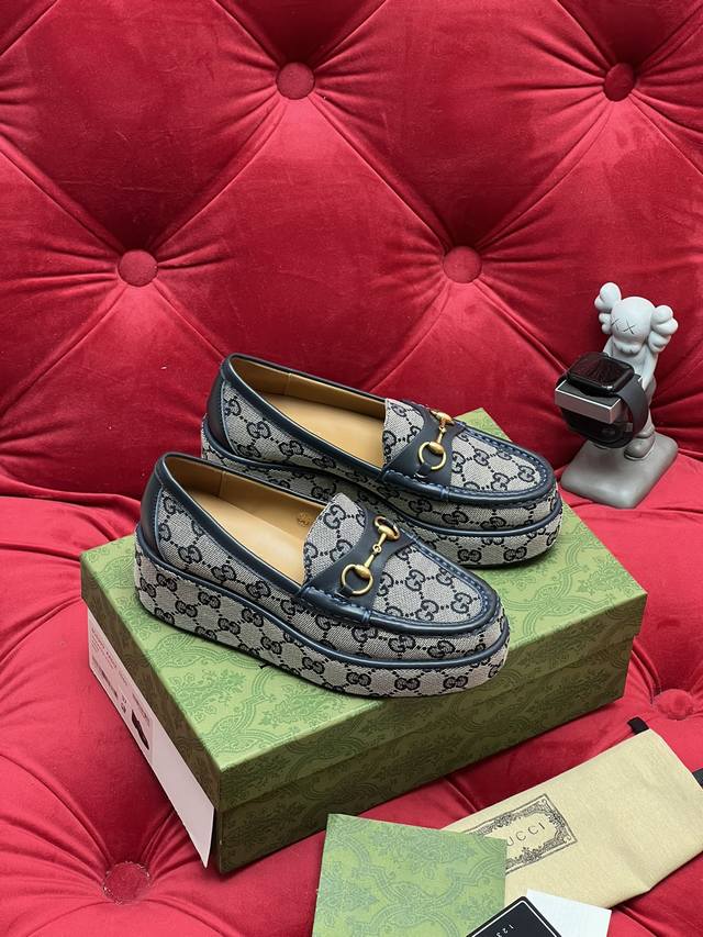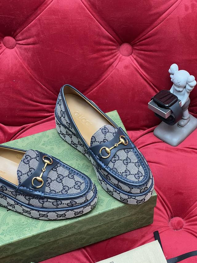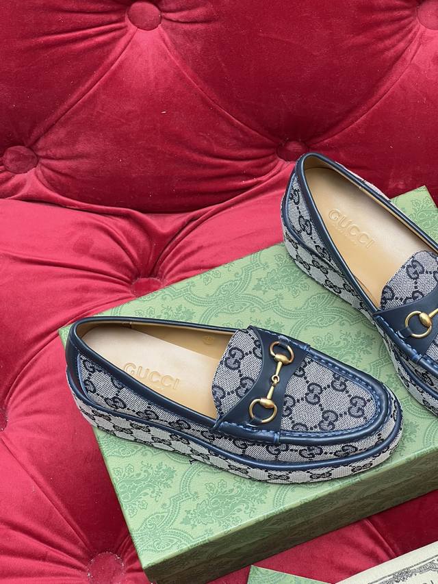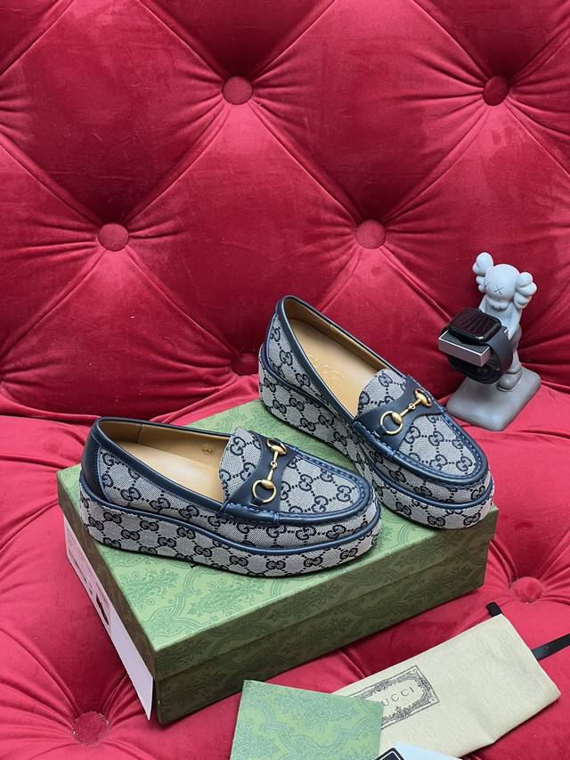 / 独家实拍 顶级版本 Gucc*古奇25Ss秋冬新品厚底水台马鞍扣 马衔扣坡跟乐福鞋 原版套楦 高端品质 面料:进口刺绣双G老花织布 原版1:1定制五金 内里 垫