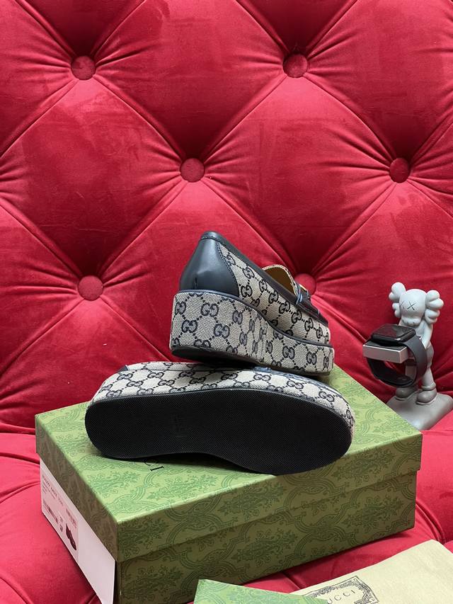 独家实拍 顶级版本 Gucc*古奇25Ss秋冬新品厚底水台马鞍扣 马衔扣坡跟乐福鞋 原版套楦 高端品质 DDD 面料:进口刺绣双G老花织布 原版1:1定制五金 DDD 内里 垫脚:定制水染羊皮 DDD 大底:原版开模耐磨橡胶组合大底 DDD 跟高:前掌高2.5 Cm 后跟高5厘米 DDD Size:35-41 40.41订做不退换 DDD