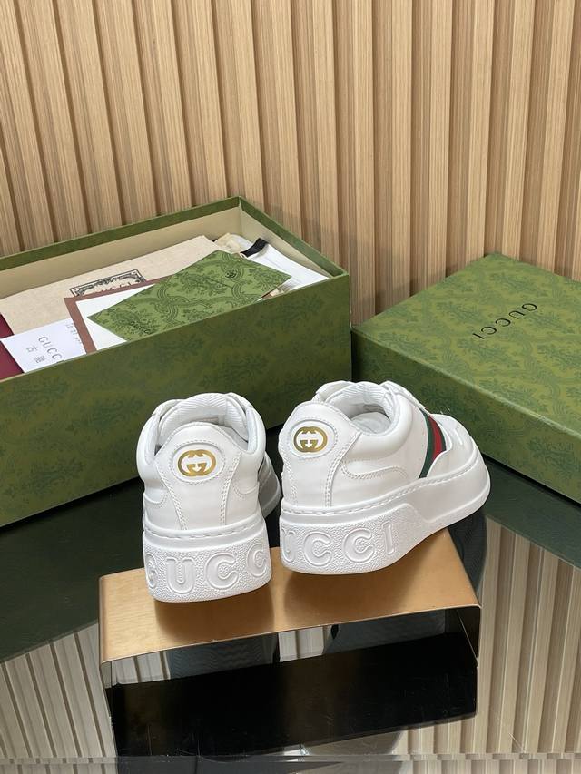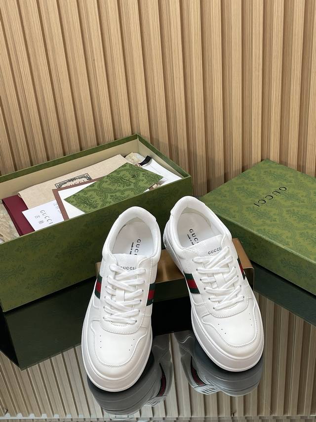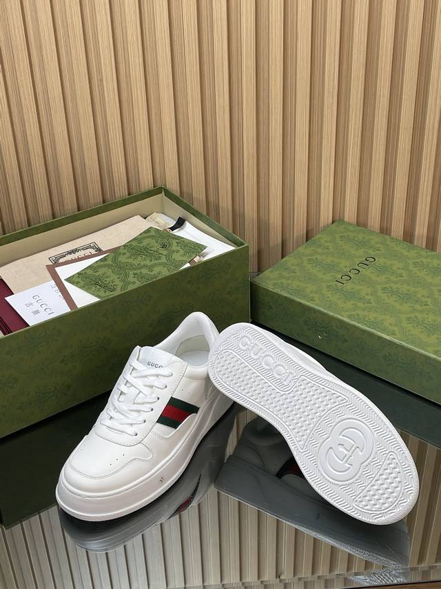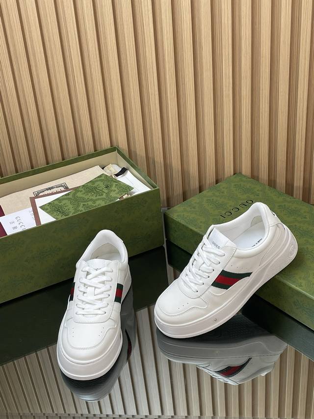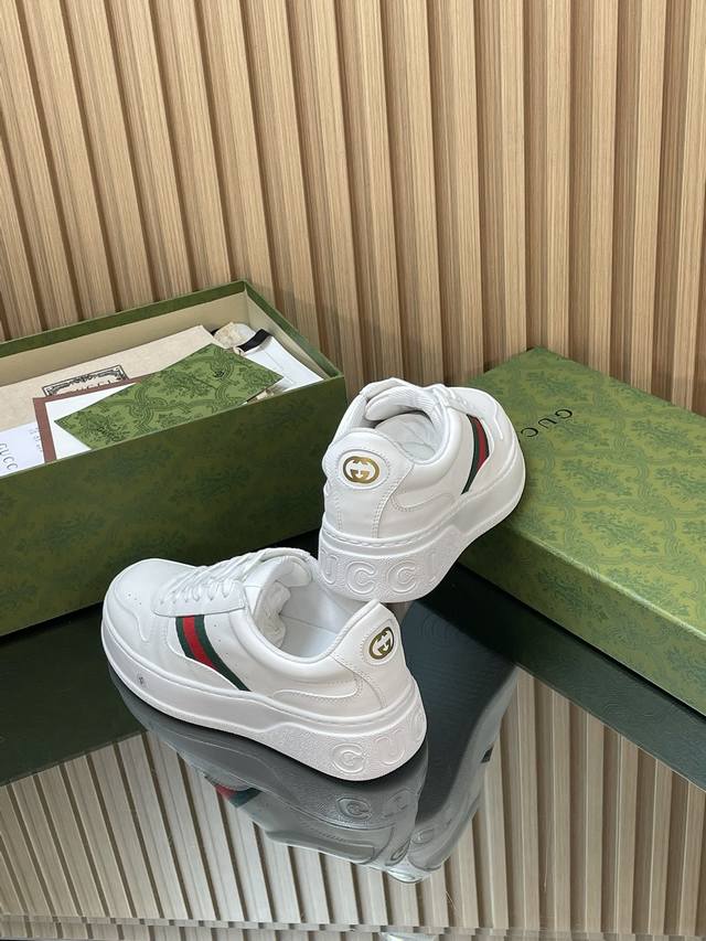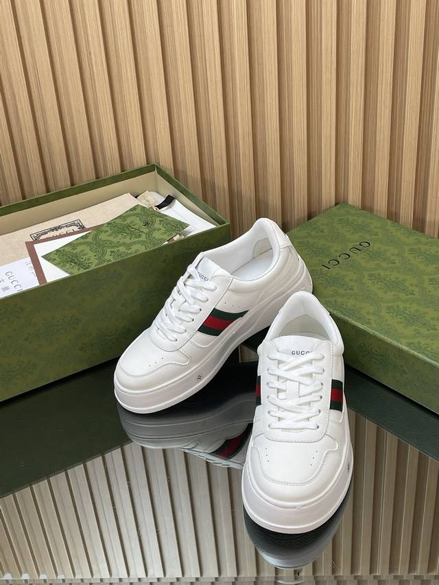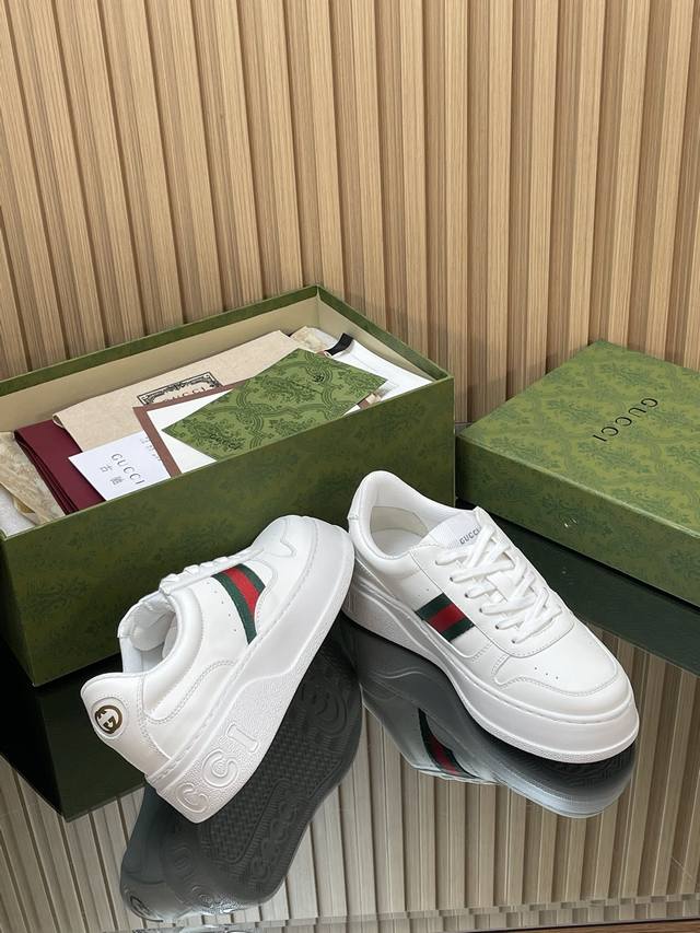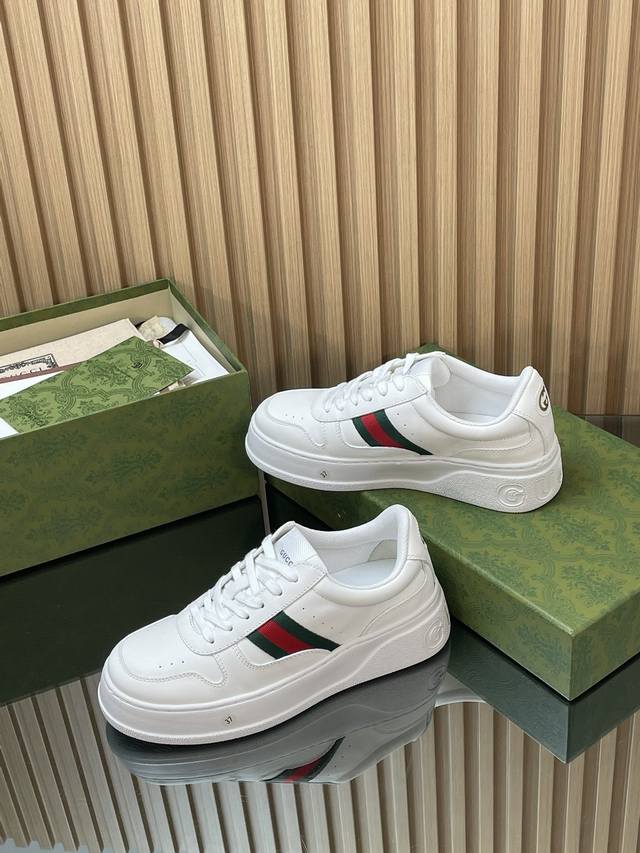 男女情侣款 2025秋冬新款Gucci厚底饼干鞋 男+50绿红绿织带休闲鞋 情侣款运动鞋情侣原版定制1:1复刻代购级最高版本可与Gz对比无差别 鞋面:进口小牛皮+品牌标志织带 内里:水染羊皮,垫脚:牛皮! 大底:1:1原版开模超轻料耐磨底 尺码:男女款35-45 男39,45,女4041定制不退换 包装:专柜航空外箱全套包装 这款2025秋冬系列运动鞋采用厚底结构,巧妙运用廊形设计,配色和材质三种元素,彰显复古风范,这款鞋履选用皮革搭配红绿织带细节,配橡胶厚底设计更添精致魅力Yyds