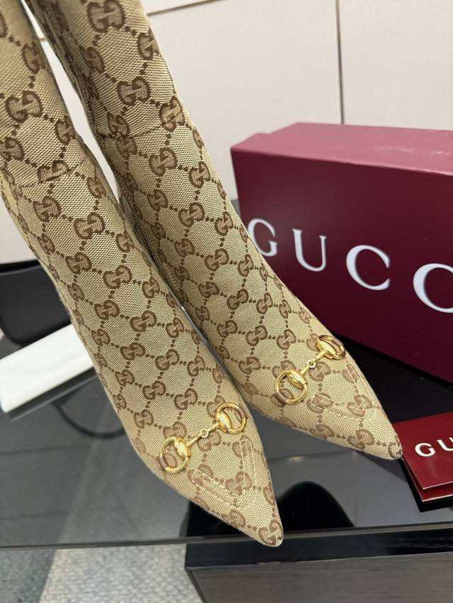 皮面 布面 Gucci 经典爆款秋冬尖头链条高跟短靴! 今年最不能错过的一双靴子!整体楦型流畅秀气,精致百搭又不失时髦感谁还没有冲啊 面料采用进口小牛皮,布料