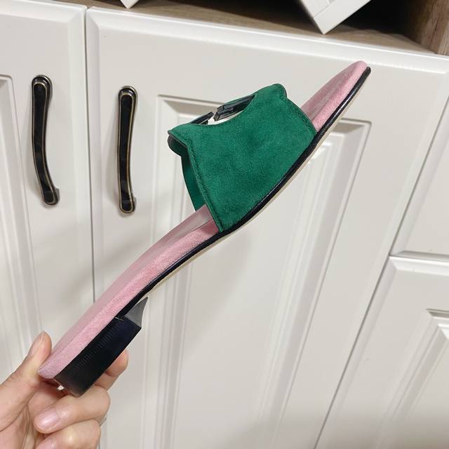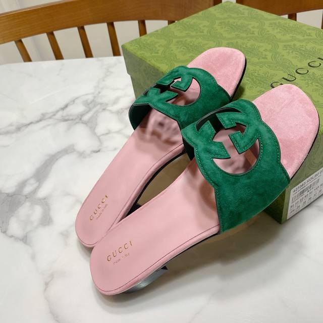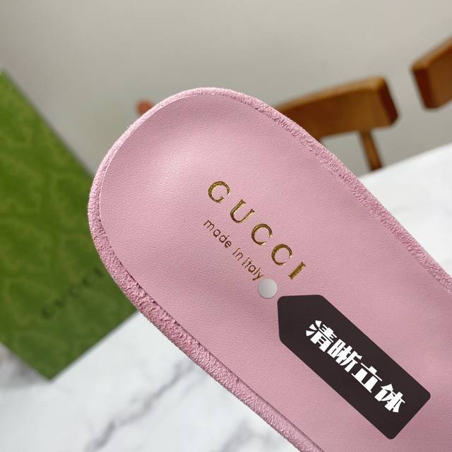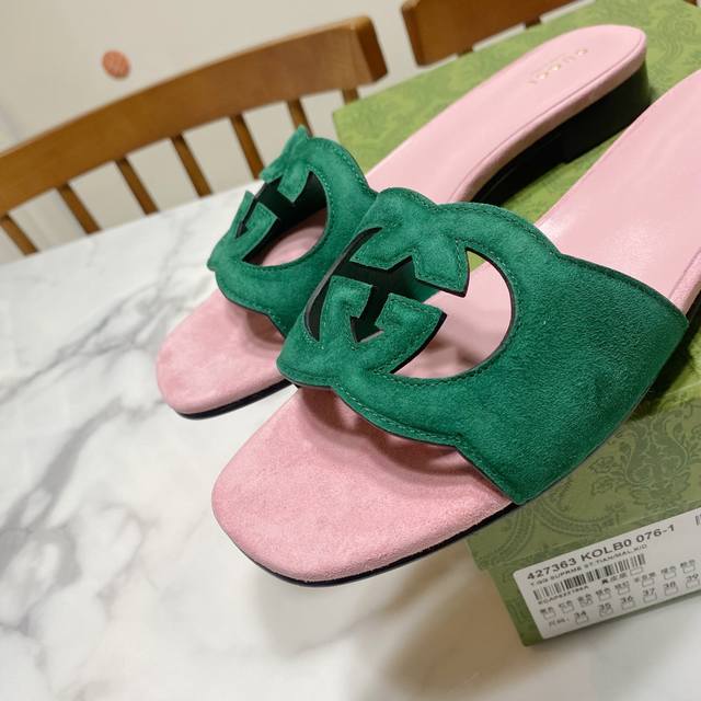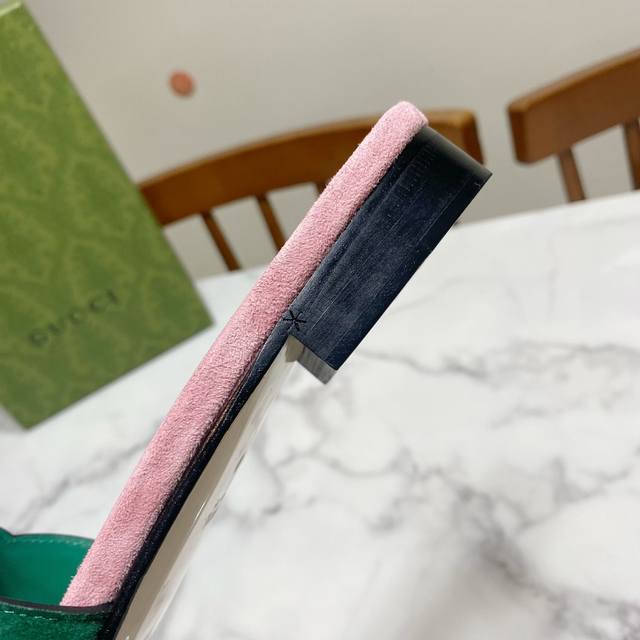 / 羊京 粉绿 Gucci 古奇 夏季最新款双平底拖,爆款镂空浮雕设计,凸显小性感,原版1:1复刻,上脚秀气好看鞋面粒面羊皮 石头纹牛皮 羊京,头里垫为山羊皮,真皮