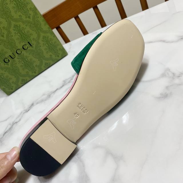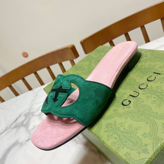 羊京 粉绿 Gucci 古奇 夏季最新款双平底拖,爆款镂空浮雕设计,凸显小性感,原版1:1复刻,上脚秀气好看鞋面粒面羊皮 石头纹牛皮 羊京,头里垫为山羊皮,真皮