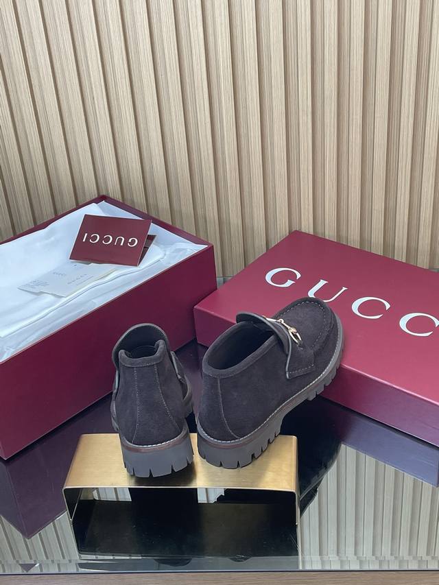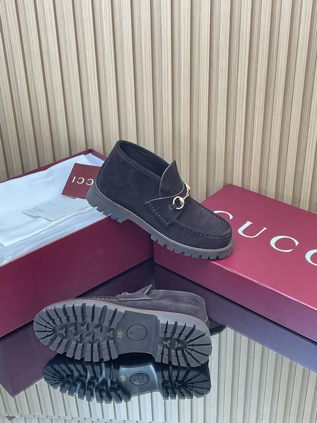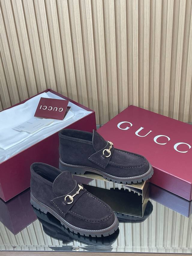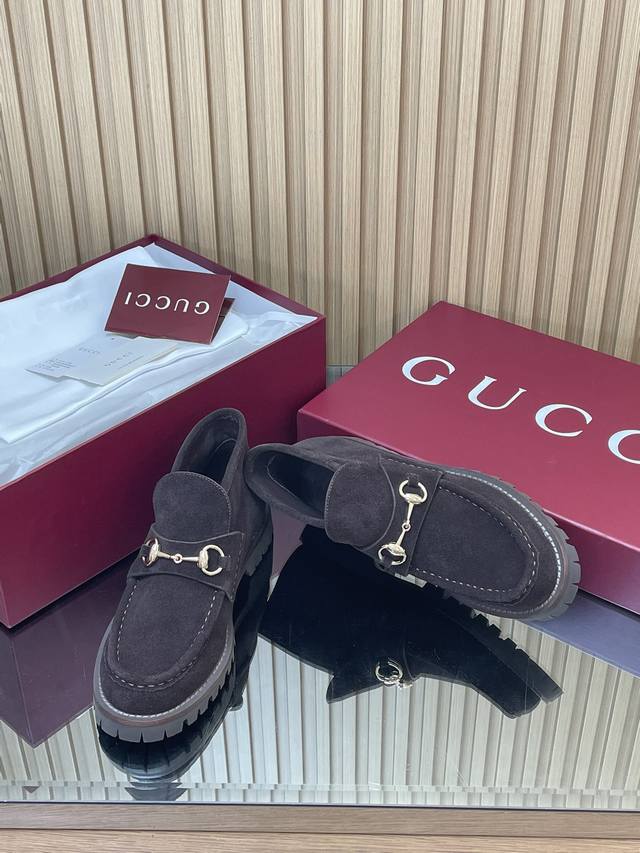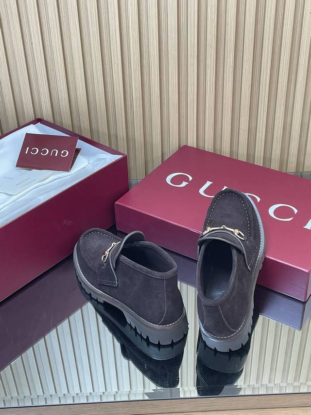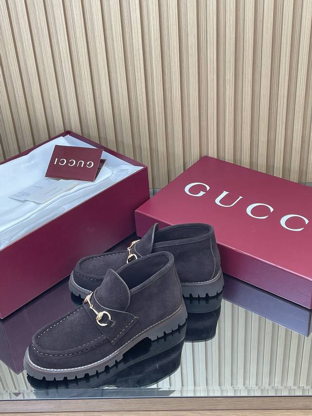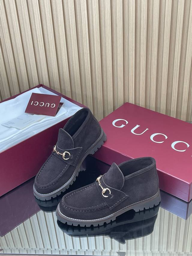 薄底女款 深棕同面色内里2025全新升级最新Gucci马衔扣厚底踝靴秋冬冲刺主推款高邦乐福鞋跑量特惠福利价 不议价! 各地专柜纷纷卖断货的一款 厚底单鞋最近都很火爆!就是因为好显瘦!Y版一致! 面料:进口绒面丝光牛反绒细腻 复古感十足,搭配G家标志性的铜制马衔扣 内里 垫脚:原版定制进口丝绸牛皮里 大底:1:1模具开发的橡胶高韧性鞋底 ,鞋边真皮沿条 绝对不死沉死硬,也绝不坍塌 所有的材质和工艺,与Y版一致 尺码:35-42标准码 404142定做 跟高:1.5Cm 包装:专柜红色高端包装 这款马衔扣裸靴