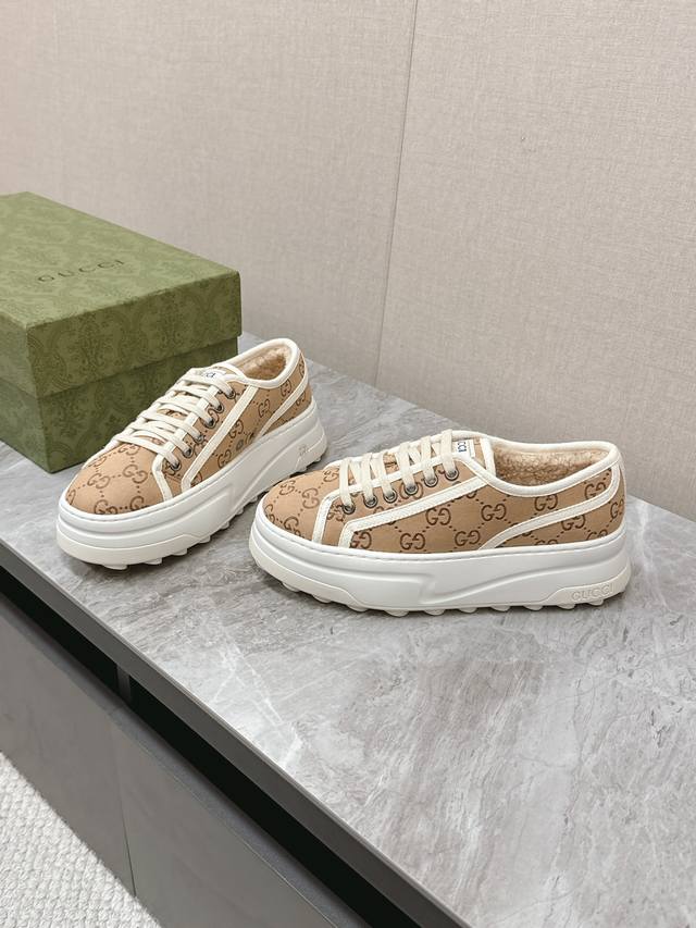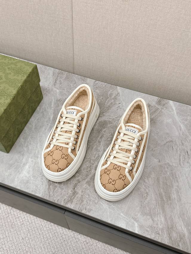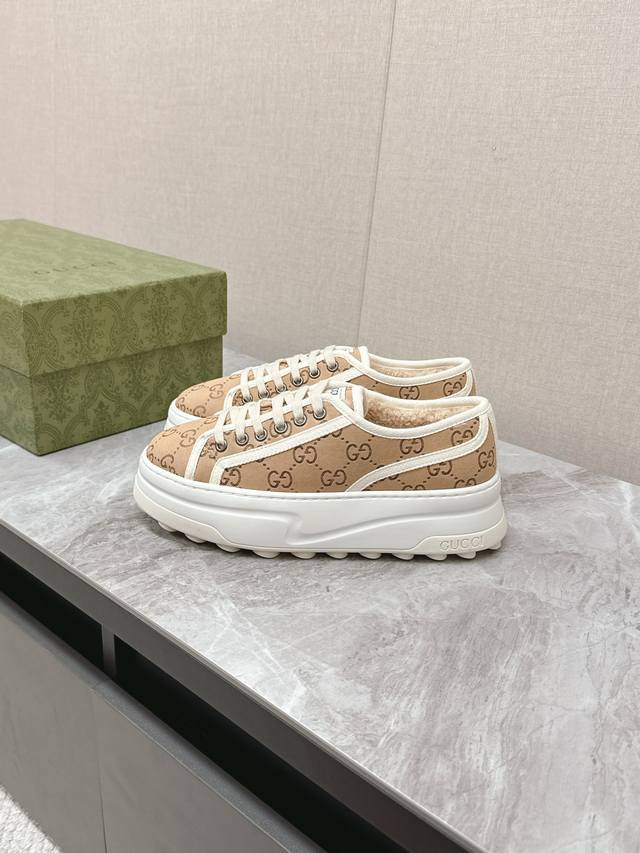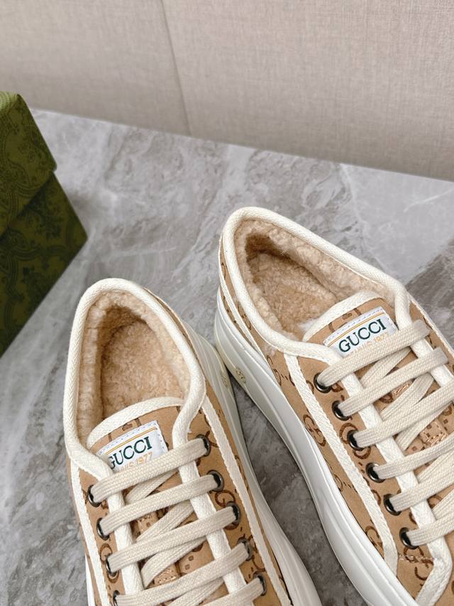 / 顶级版本 GuccⅠ 古驰秋冬毛鞋 这件亮眼吸睛的单品从网球世界中汲取创作灵感。这款运动鞋采用同色调米色和乌木色经典Gg帆布制成,厚实鞋底和撞色织物滚边流露现代