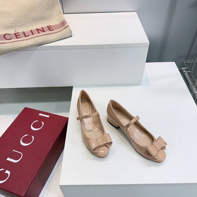 高品质出厂 !顶级品质Gucci古驰2025秋冬新款G家新款漆皮一字扣带玛丽珍粗跟圆头单鞋 这款浅口鞋甄选进口软漆皮打造,匠心融蕴经典蝴蝶结造型配件,中跟圆头和