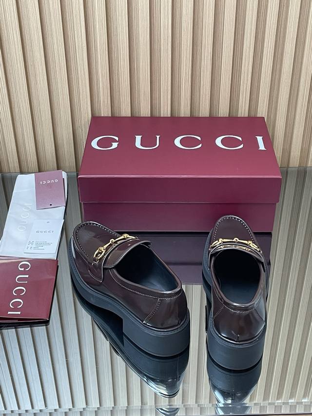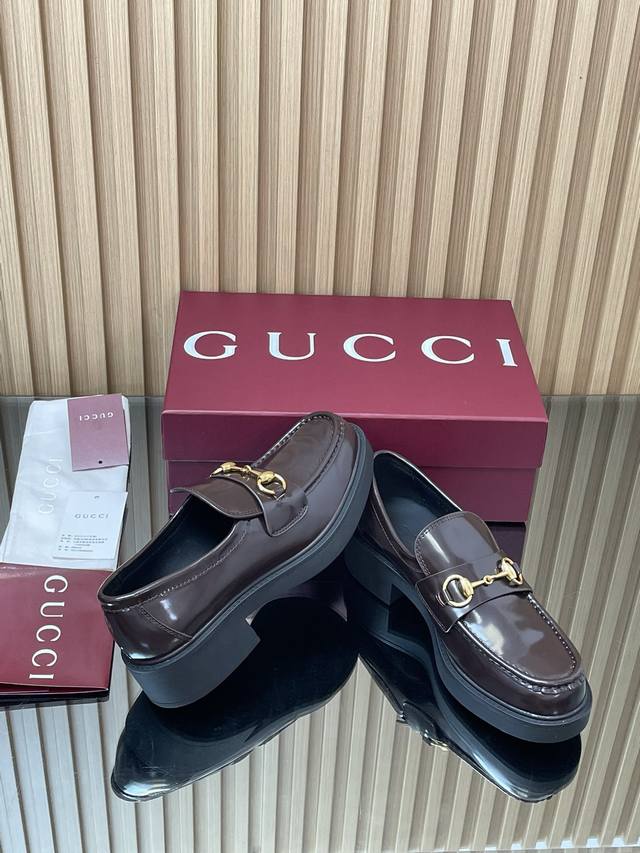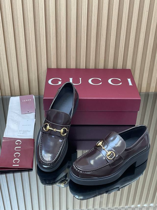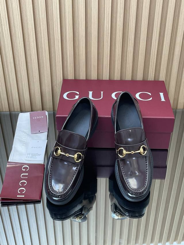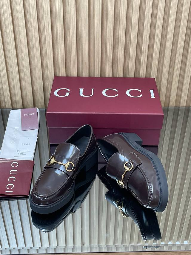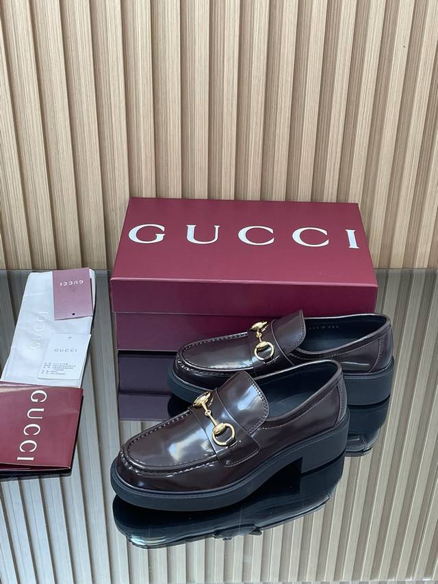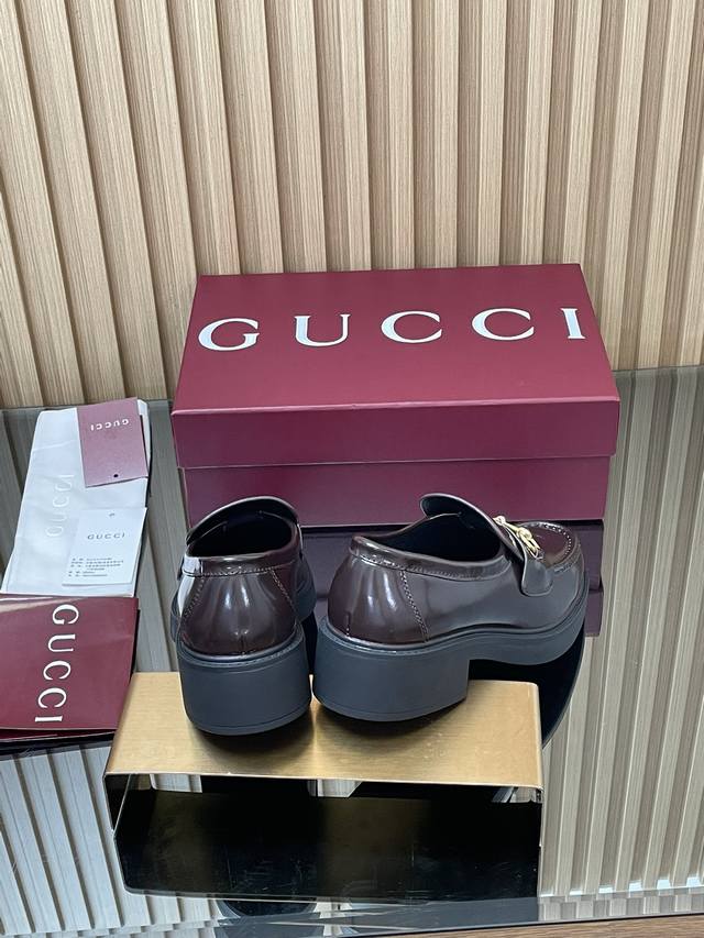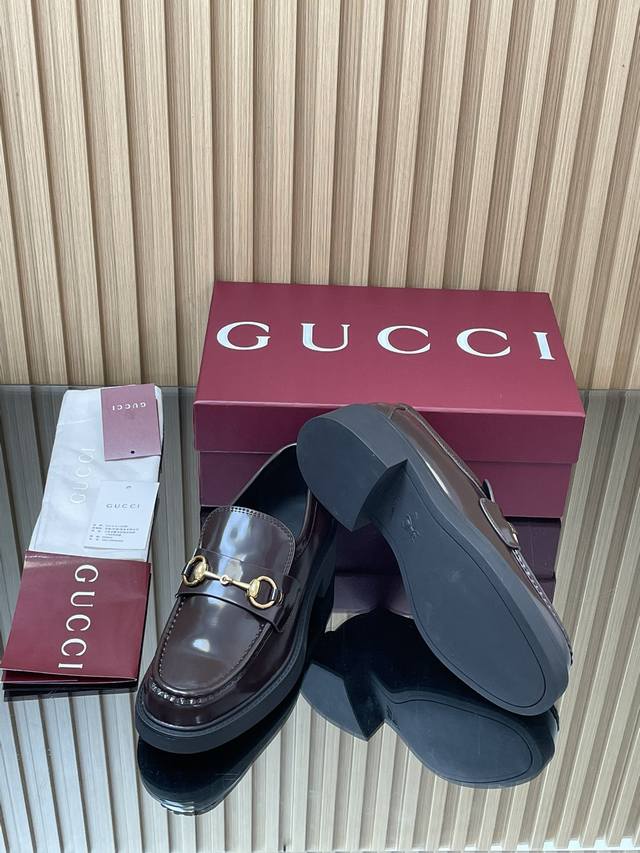 2025古奇秋冬最新Gucci 沟纹小蜜蜂底马衔扣厚底乐福鞋 安可拉酒红内衬单鞋代购级别 高端精品尖货 这款乐福鞋匠心融蕴靴子和软帮薤鞋设计中的时尚元素,配以轻质发泡橡胶沟纹小蜜蜂鞋底 ,典藏图案继续在Gucci全新系列中大放异彩,经典马衔扣造型配件彰显品牌马术传承。令整个设计魅力倍增,为日常鞋款注入精致考究气息 面料:进口开边珠 丝绸小牛皮+浅金马衔扣 内里 垫脚:安可拉酒红丝绸牛皮 大底:1:1模具开发的橡胶发泡高韧性小蜜蜂底 绝对不死沉死硬,也绝不坍塌 所有的材质和工艺,与Y版一致 尺码:35-42