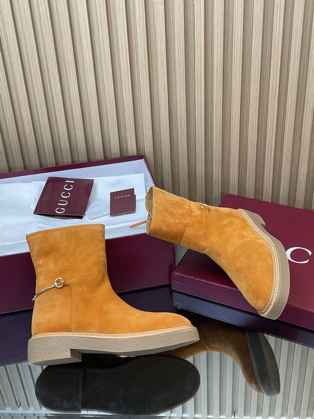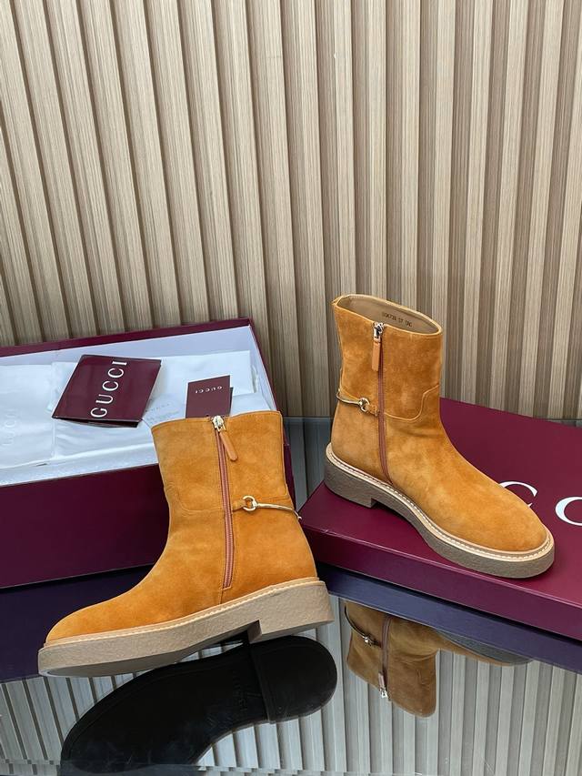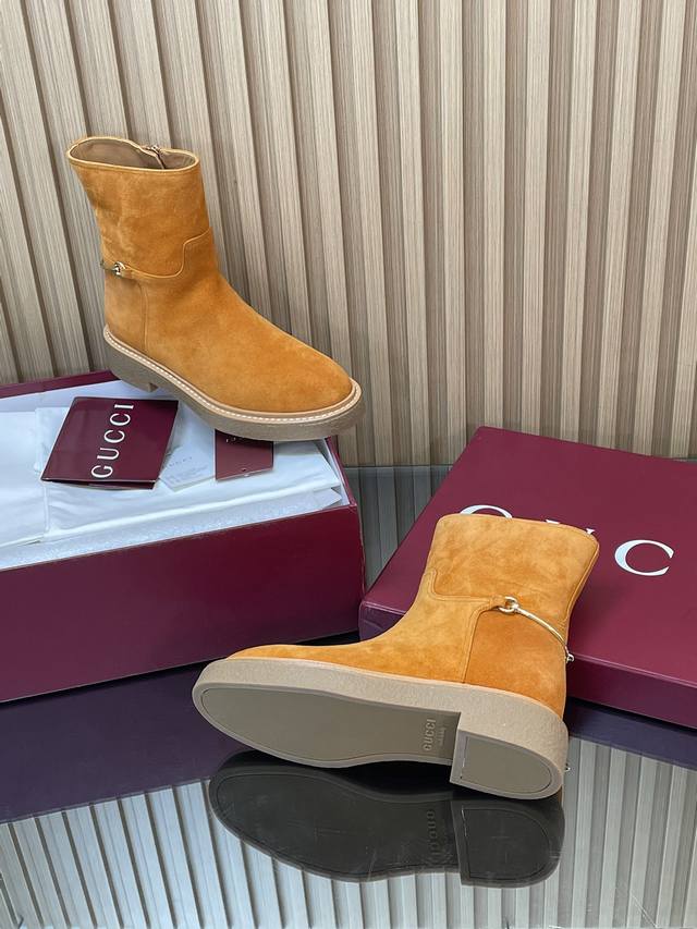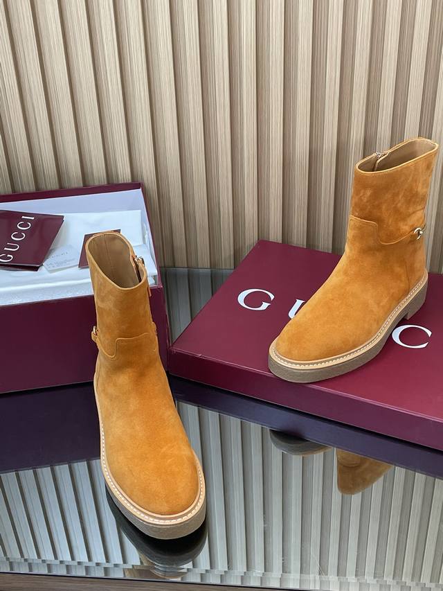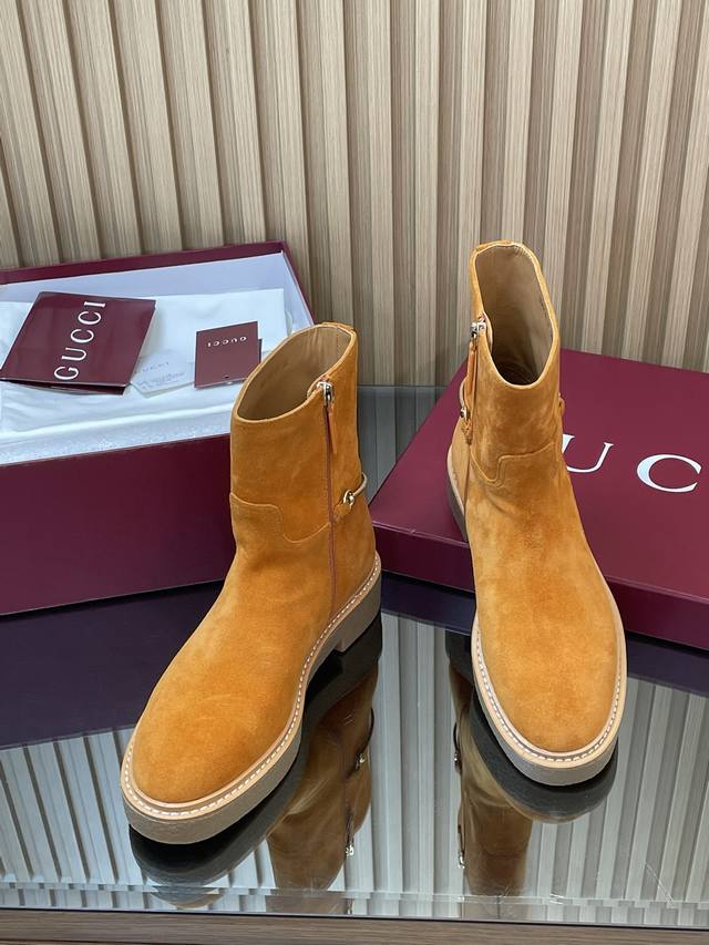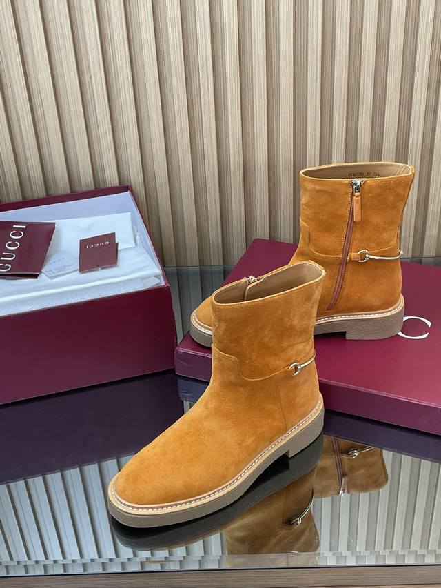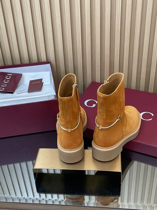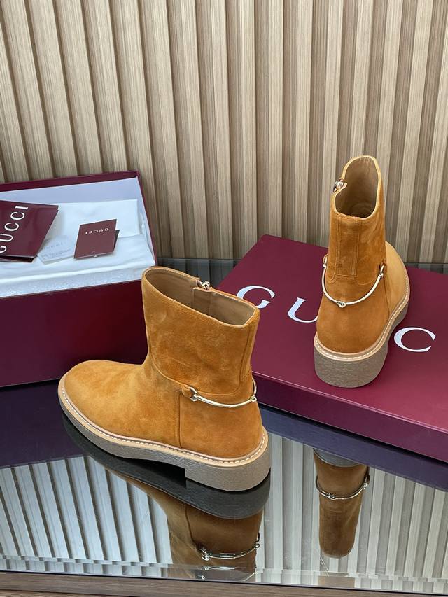 2025古奇 Gucci 秋冬修长造型马衔扣马术裸靴 走秀款切尔西靴顶级代购级 年底冲量底价 进口丝光绒短靴重工艺所有制作整个做工与原版一致! 这款靴子甄选进口丝光绒鹿皮制作,巧妙融入修长造型马衔扣细节,致敬品牌源远流长马术本源传承。经典廊形精致考究,诠释Gucci优雅美学风范 材质1:1原版定制 进口丝光绒鹿皮+红绿织带 内里 牛皮里是整张一块皮无断开没任何拼接的 大底.开模成型耐模生胶底 尺码35-42 404142定制,不退换