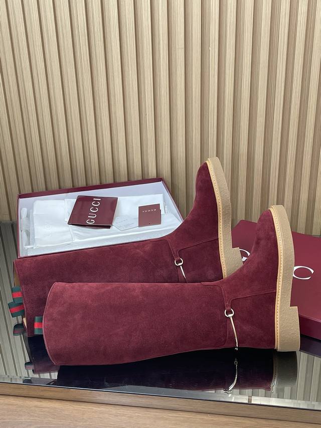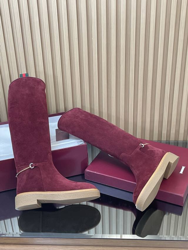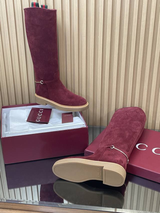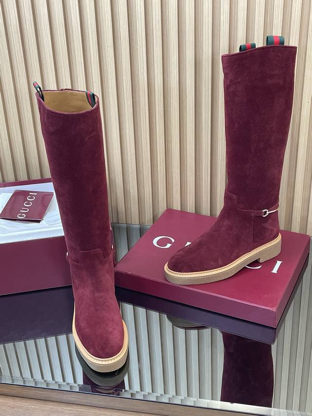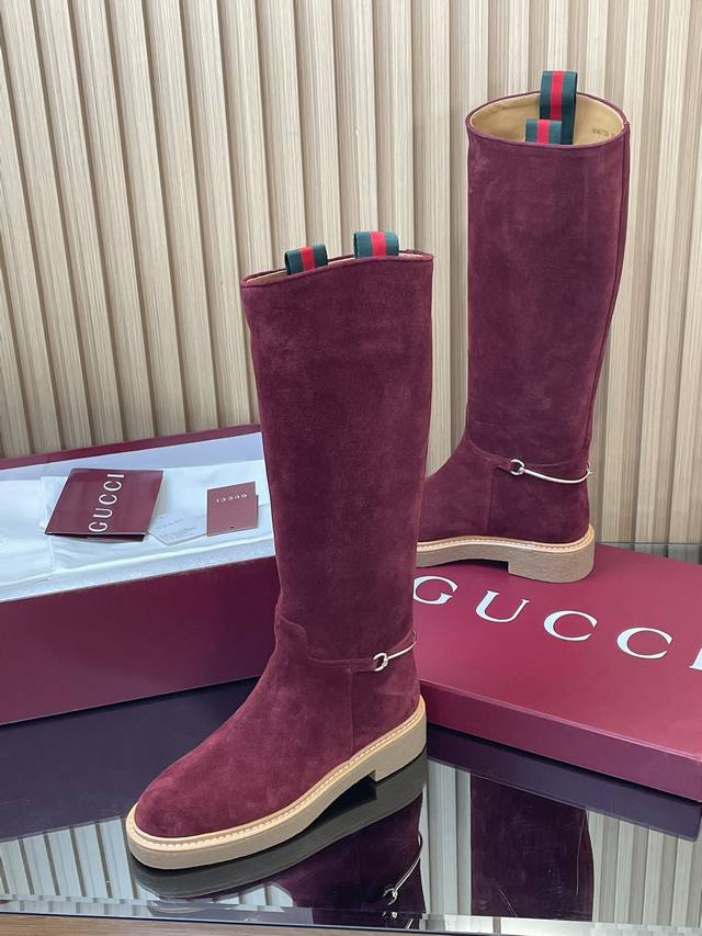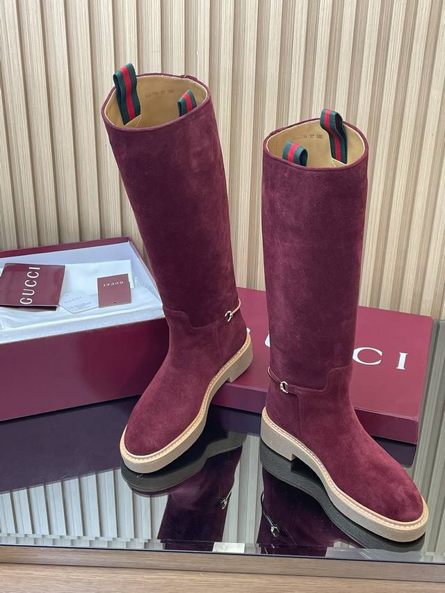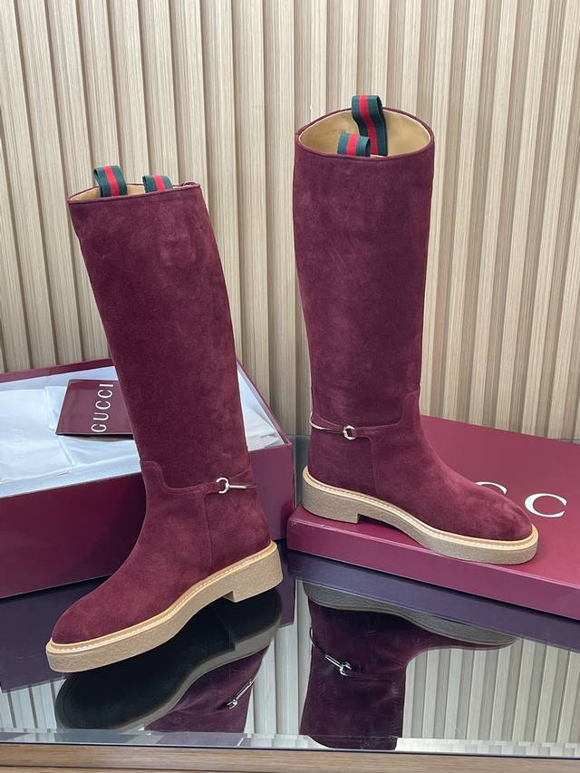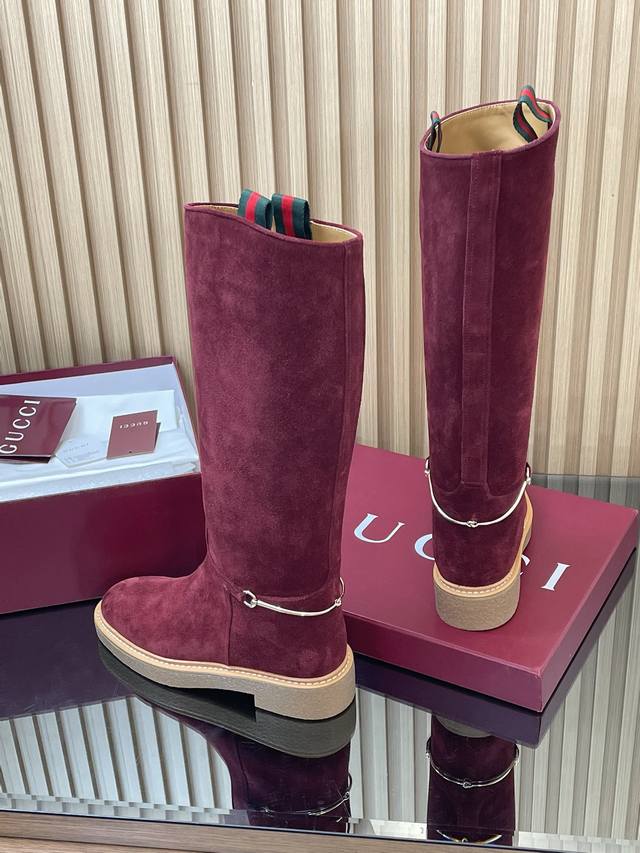 2025古奇 Gucci 秋冬修长造型马衔扣马术长靴 走秀款过膝靴顶级代购级 年底冲量底价 进口丝光绒长靴重工艺所有制作整个做工与原版一致! 这款靴子甄选进口丝光绒鹿皮制作,巧妙融入修长造型马衔扣细节,致敬品牌源远流长马术本源传承。经典廊形精致考究,诠释Gucci优雅美学风范 材质1:1原版定制 进口丝光绒鹿皮+红绿织带 内里 牛皮里是整张一块皮无断开没任何拼接的 大底.开模成型耐模生胶底 尺码35-42 404142定制,不退换 包装:最新高端安可拉红色包装