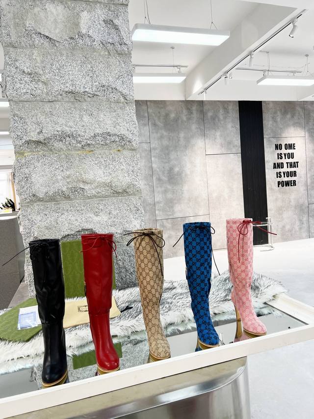 2025年Gucci最新款 高跟8.5Cm,靴筒高40Cm,大腿围39Cm。 布面橡胶底p:340米, 真皮底p: 米。 混种羊皮橡胶底p:520米, 真皮底p