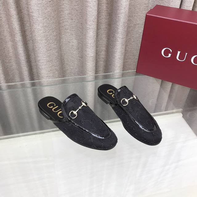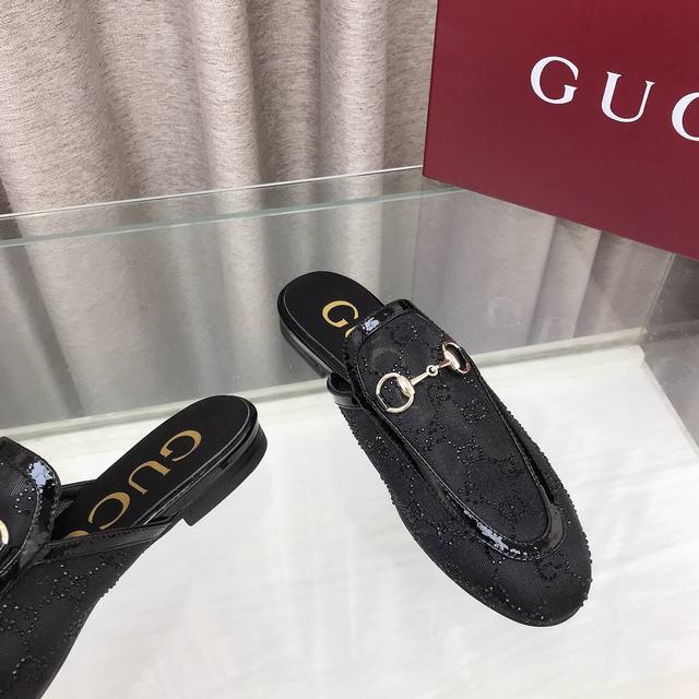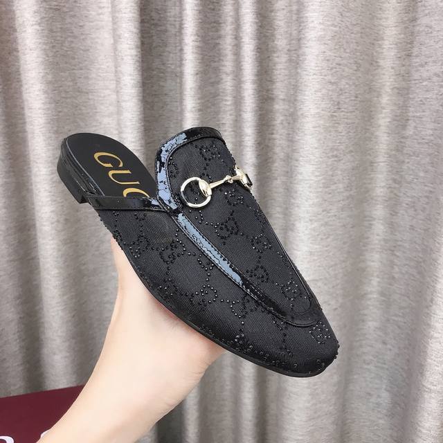 橙子出厂价p gucci 古驰 春夏新款 双G扣布面 水钻网纱 方头平底拖鞋 休闲凉拖 码数 35-39 可定制34.40.41.42