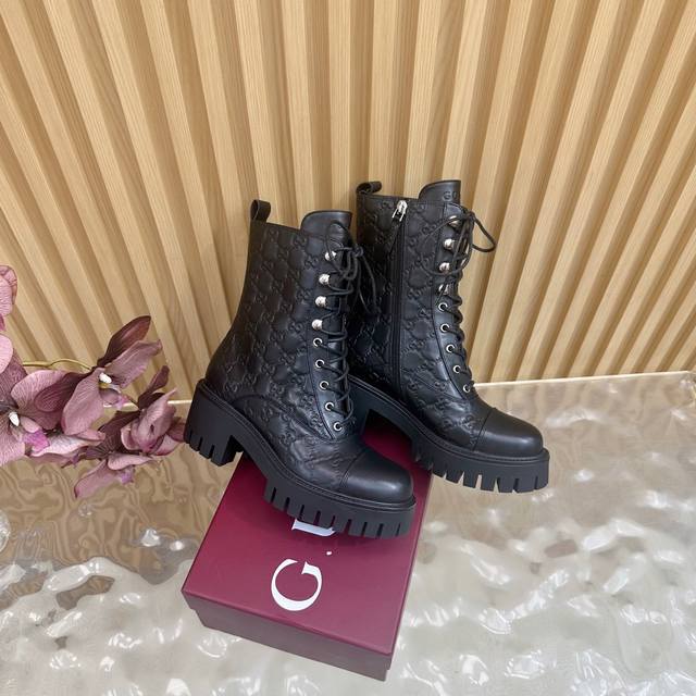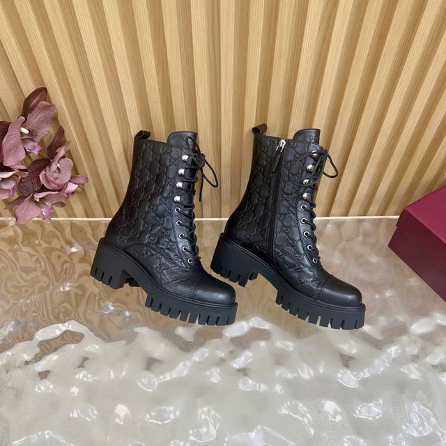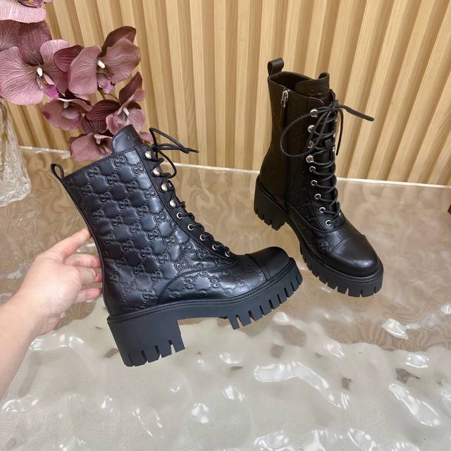 2025秋冬 Gucci 古奇Ss新款双G压纹系带登山马丁靴 女士骑士踝靴顶级品质! 面料:进口古软G G压纹牛皮 内里 垫脚:原版定制牛皮里 大底:原版开模沟