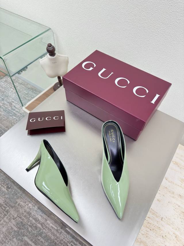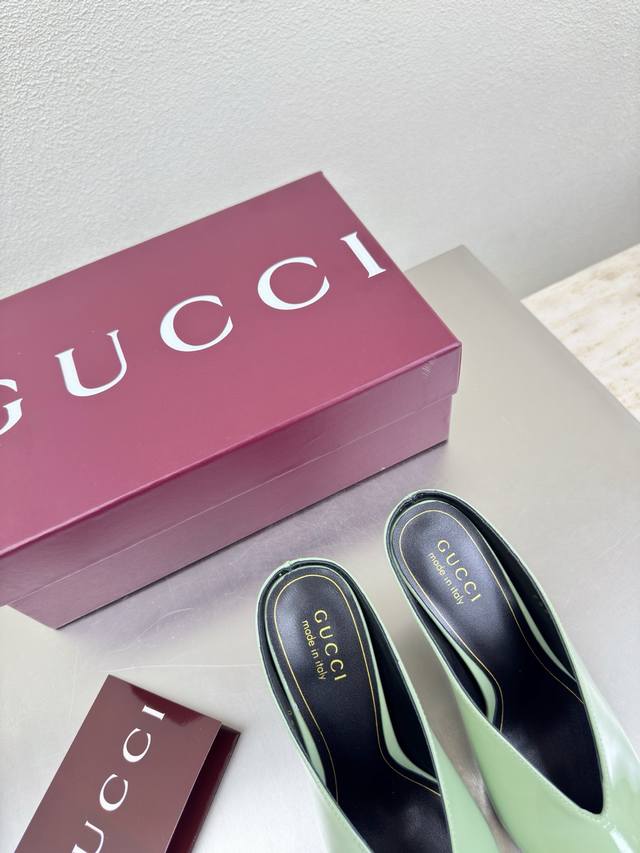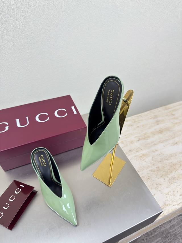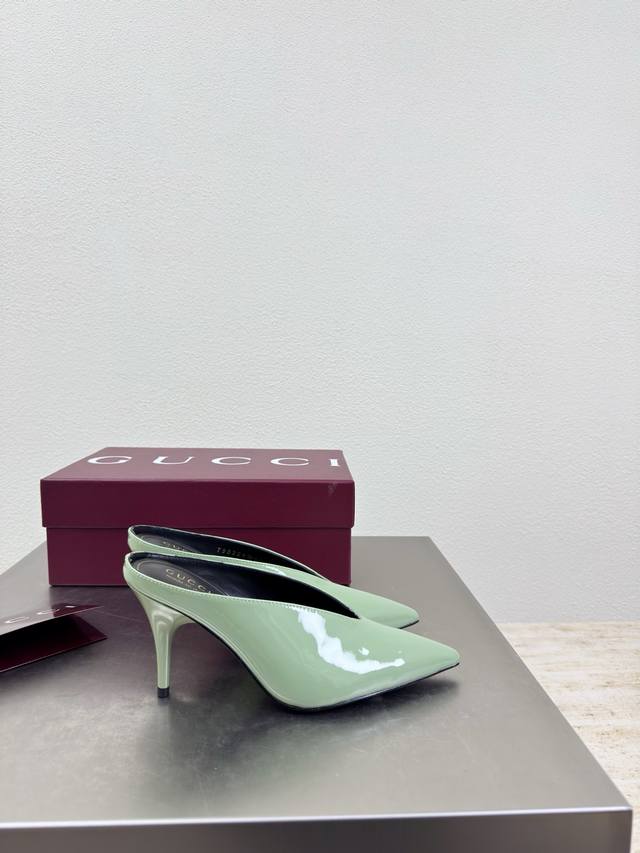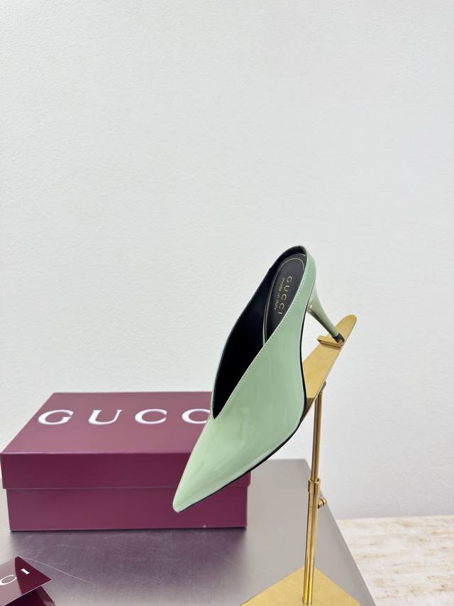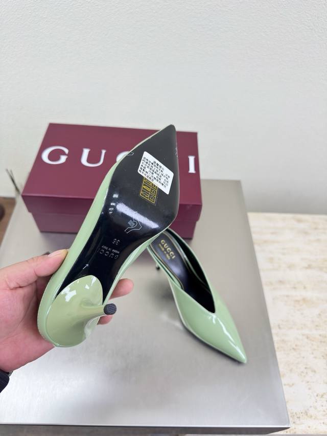 / 26高定Gucci深口尖头拖鞋 淡绿色 小牛漆皮 马鞍扣 新款Gucci 爆单品 鞋面采用原版水钻镶嵌 经典Logo 精美金色垫脚Logo 意大利进口真皮大底