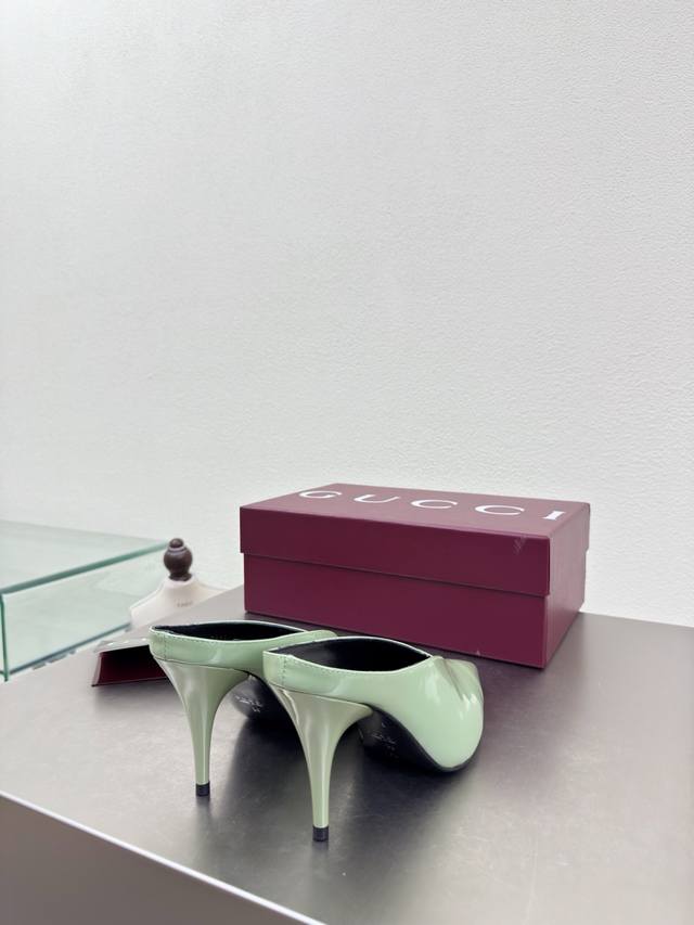 26高定Gucci深口尖头拖鞋 淡绿色 小牛漆皮 马鞍扣 新款Gucci 爆单品 鞋面采用原版水钻镶嵌 经典Logo 精美金色垫脚Logo 意大利进口真皮大底