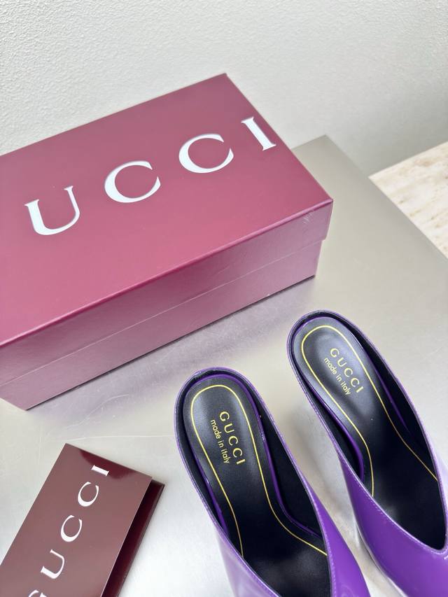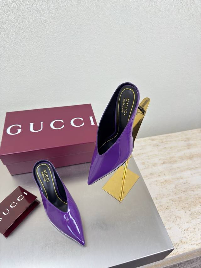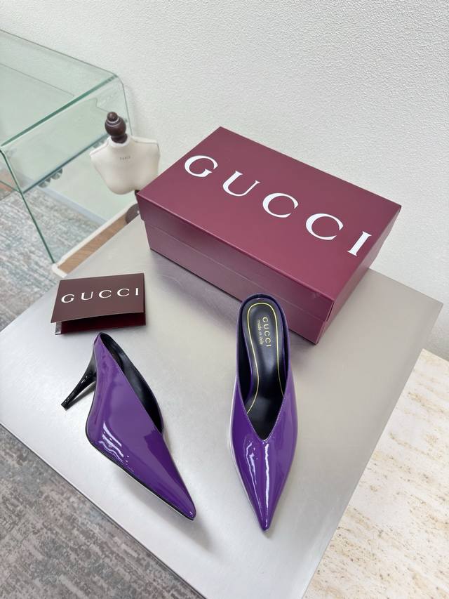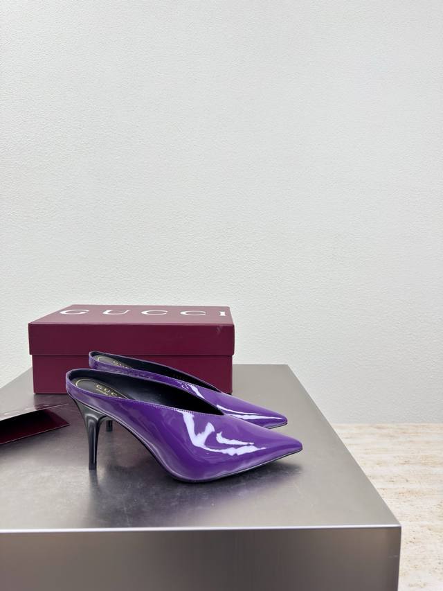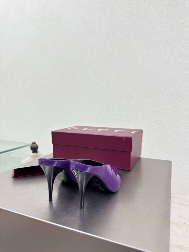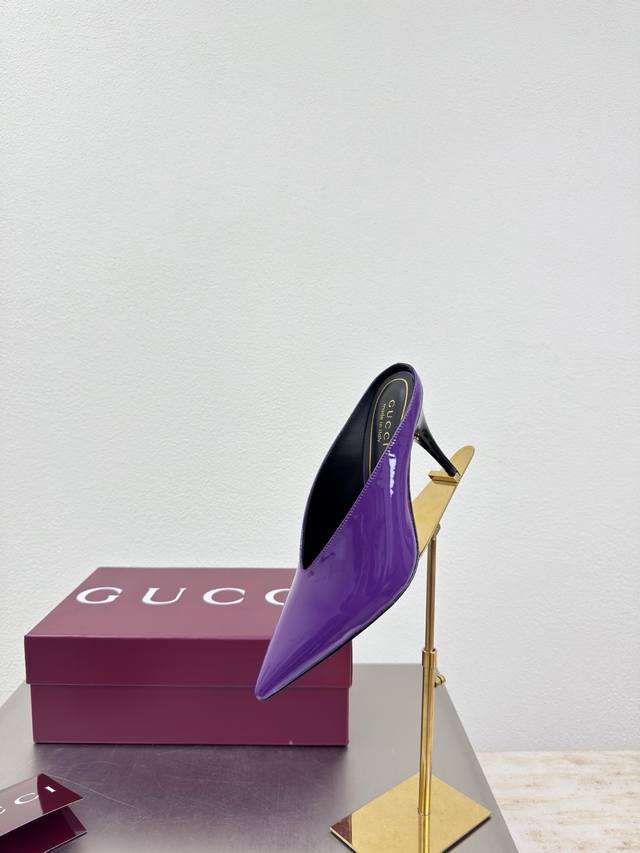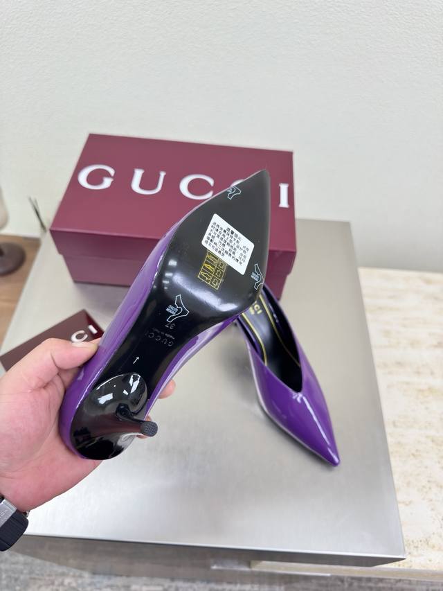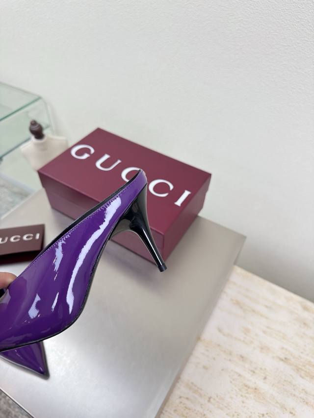 26高定Gucci深口尖头拖鞋 紫罗兰 小牛漆皮 马鞍扣 新款Gucci 爆单品 鞋面采用原版水钻镶嵌 经典Logo 精美金色垫脚Logo 意大利进口真皮大底
