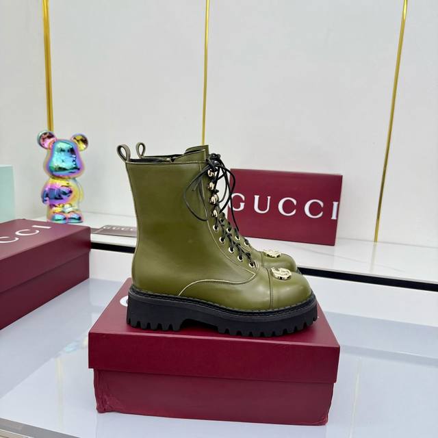 / 2660新版古驰Gucci百搭绑带马丁靴 跟高:5Cm 面料:头层牛皮 内里 垫脚:羊皮里。 大底是发泡大底材质 颜色:黑色 码数:35-41