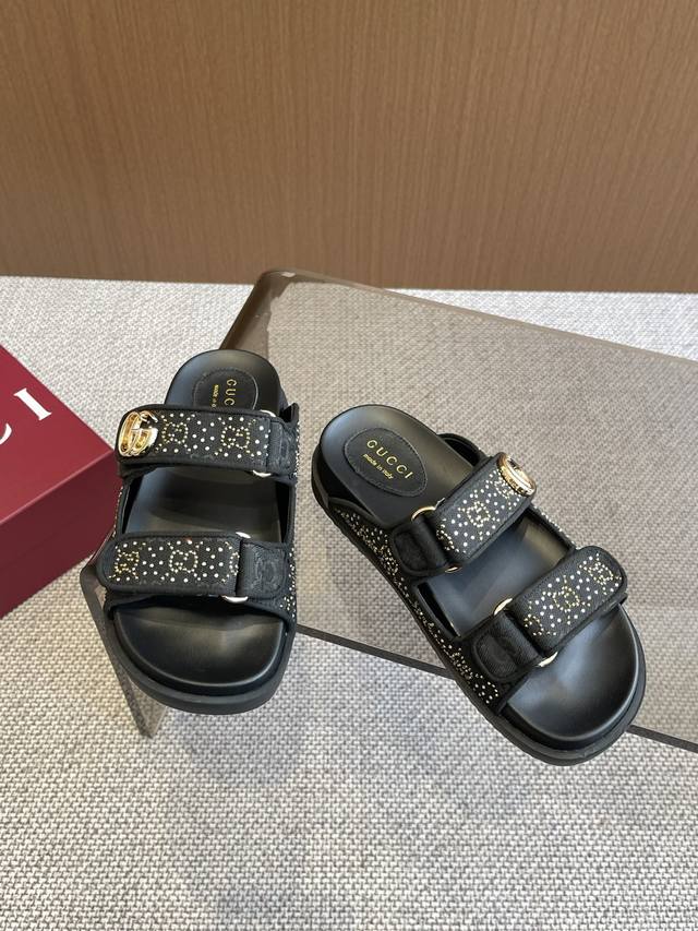 350Gucci古驰 女士安格拉红色Gg水晶双G帆布平底凉鞋 这款平底凉鞋采用魔术粘带设计,现代感十足且充满运动气息,带来舒适感受。这款配饰以安哥拉红色Gg水晶帆布匠心打造,鞋面绑带缀饰雅致的 安格拉红色Gg水晶帆布