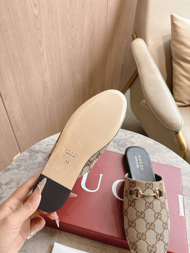 / 3669-1 杏G 35-41 自问世以来,拖鞋一直是Gucci系列的标志性产品。这款女士穆勒鞋巧妙结合米色和乌木色经典Gg帆布与拖鞋设计元素,于经典配色中绽放