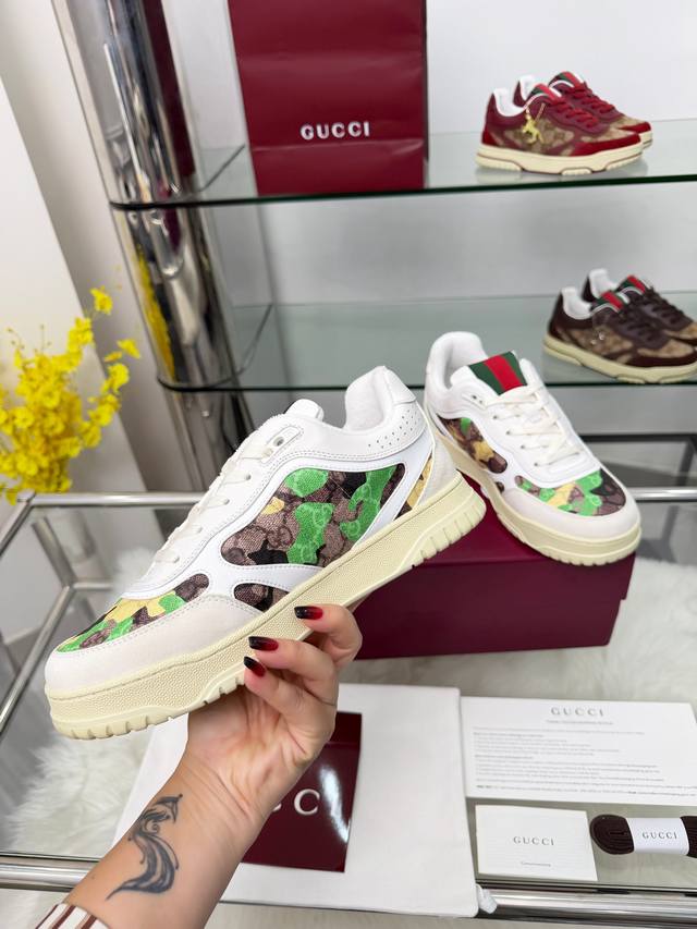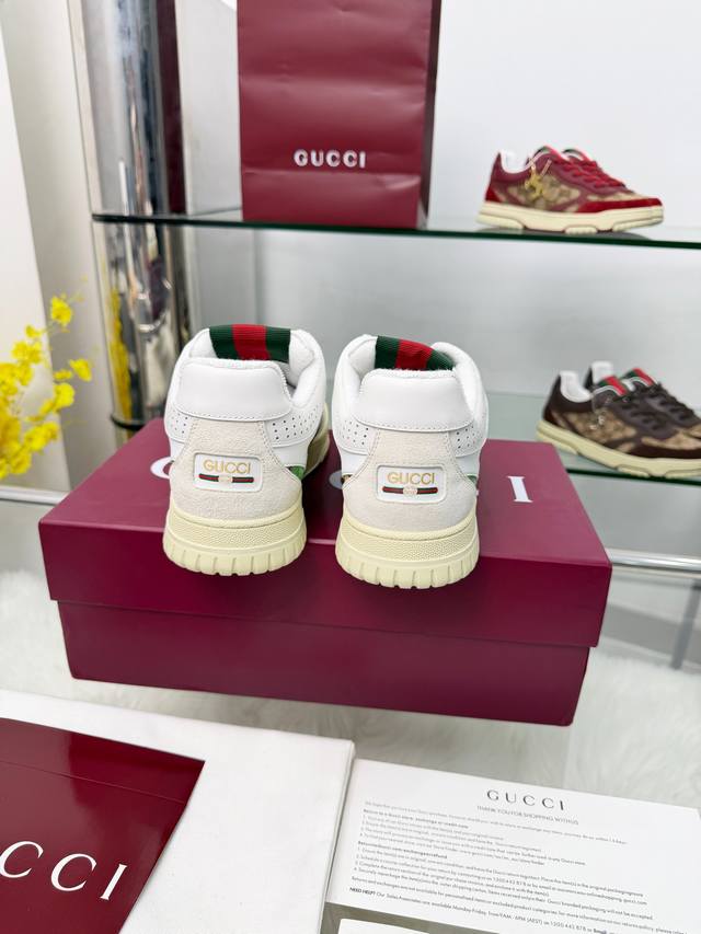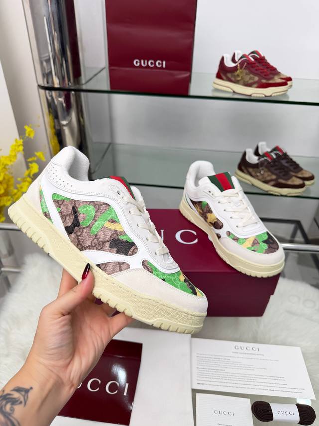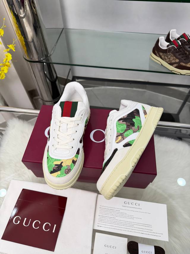 9097-2男女款 出厂价p Ddd 多种清新色彩组合焕新诠释Re-Web系列现代廓形的百变魅力,凸显Gucci经典细节。这款运动鞋甄选鹅卵石纹皮革打造,饰以Gg轮廓图案,精心缀饰标志性红绿织带滚边,一展别致风尚。 Ddd 尺码:女35-40 40订 男39-46 39.45.46订做 Ddd 包装:全套包装 DDD