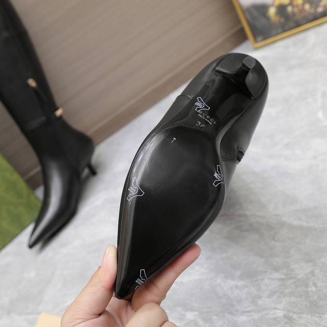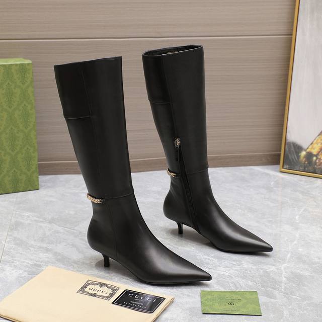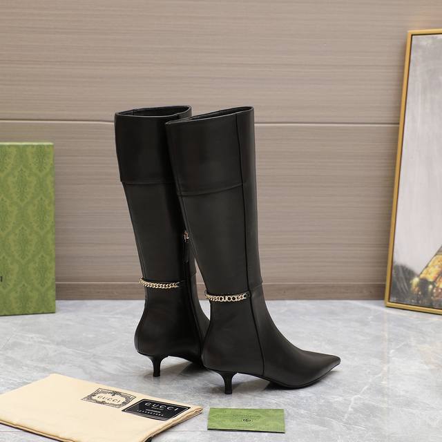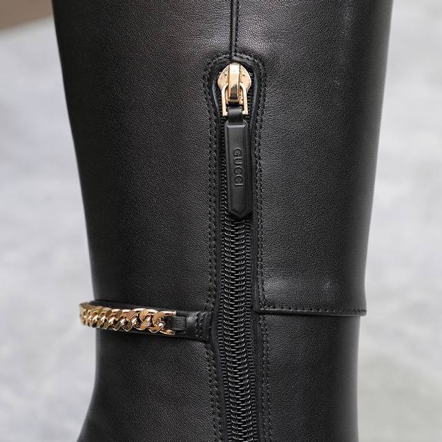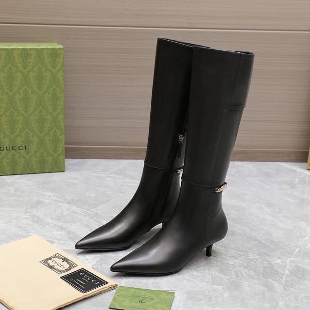 G家新款Gucc字母扣L O G O链条中跟短靴尖头长靴 DDD 顶级版本、欢迎比对. 原版1:1复刻 DDD 注意市面通货内里很多都不对版哦请认准咱家正品保证 DDD 鞋面:全粒纹高档小牛皮 DDD 内里 垫脚:全粒纹高档小羊皮 DDD 鞋底:意大利顶级真皮底 DDD 筒长:16寸长靴 DDD 跟高:4.5Cm 10.5Cm DDD 配码:35-42 41 40 42定做不退换 DDD 包装:原版全套绿色包装 DDD 厂价p: DDD Gucci创作总监推出全新尖头链条及踝鞋靴,对于性别平等和倡导女性赋