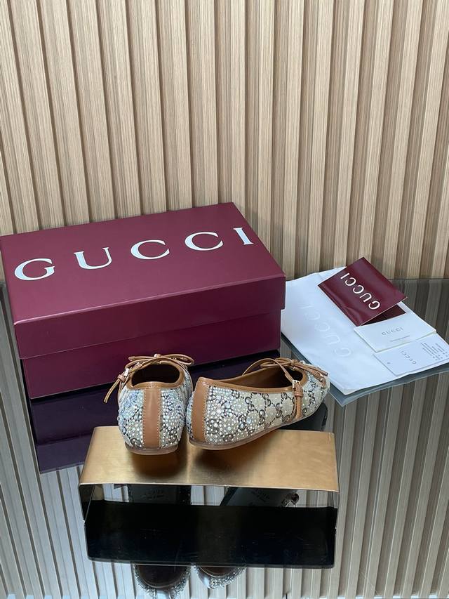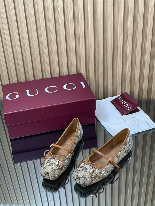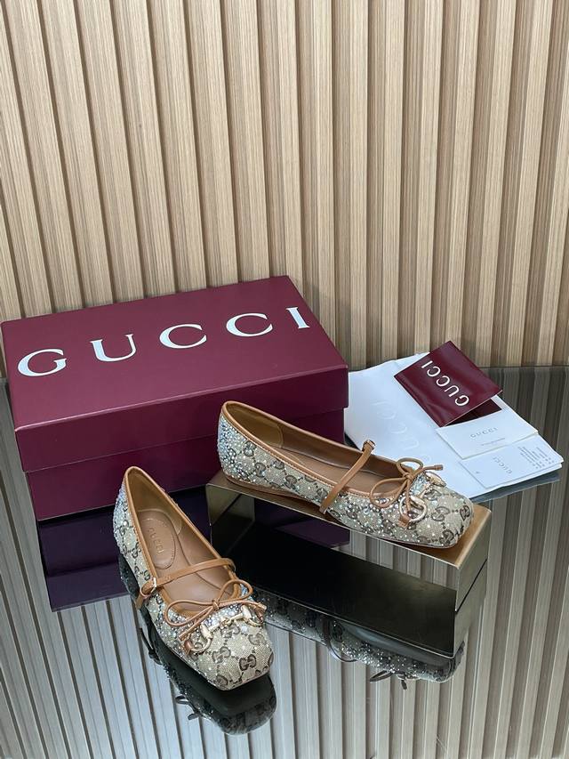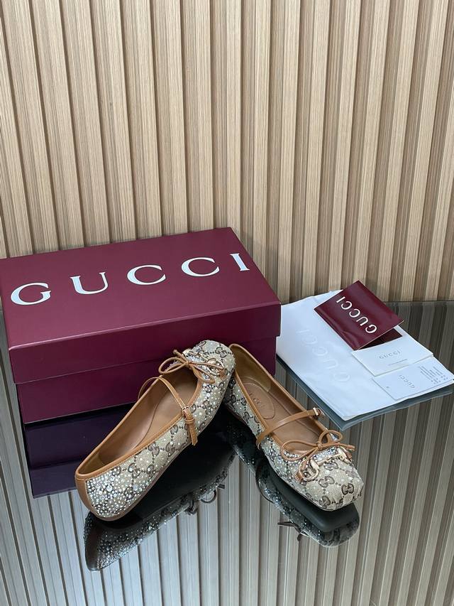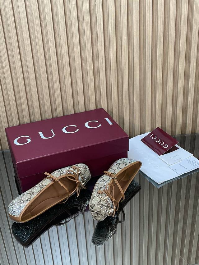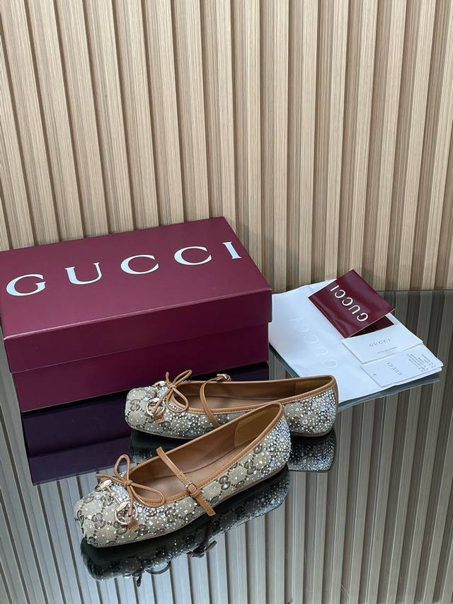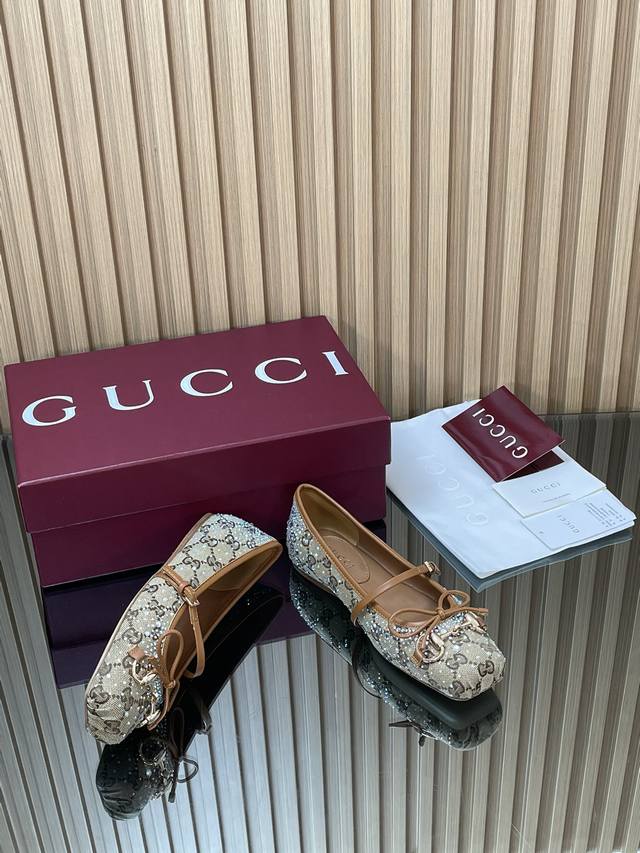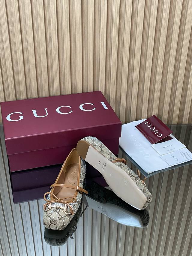 Gucc高端精品 2025早秋系列新品平底G G水晶钻芭蕾鞋 闪闪发光发亮马衔扣新款小方头单鞋经典精致优雅俏皮时髦平底鞋高质感甜美学院风便鞋 原汁原味原单品质每个细节皆经过精心细致打造,可与Zg对比如一,无二品质! 2025秋冬系列这款标志性马衔扣平底芭蕾舞鞋采用方形鞋头,搭配雅致的蝴蝶结细节,向传统芭蕾舞鞋款型致敬,这款单品采用G G帆布匠心打造,手工镶烫多刻面幻彩水晶钻,缀饰浅金马衔扣,配以柔软加衬套包内底,打造出高级奢华舒适穿着体验 面料:原版定制进口G G老花帆布+幻彩水钻 五金:东莞大厂开模铆钉