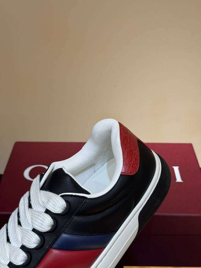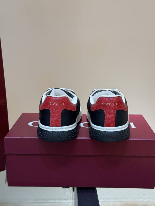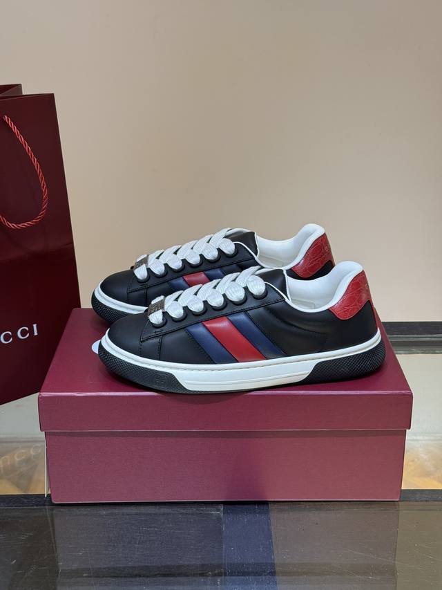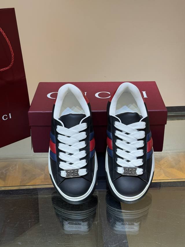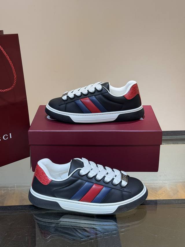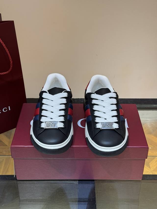 / Gucc* 新款Ace情侣款休闲运动鞋, 休闲复古面包小白鞋 顶级品质 品相完美 精致小巧的互扣式双G标识浪漫诠释此系列的美学理念。选用黑色色皮革,复古灵感巧妙