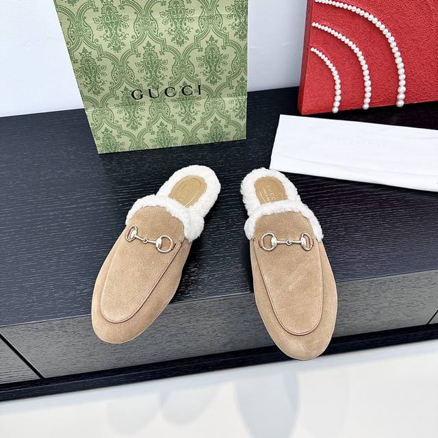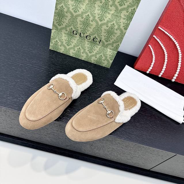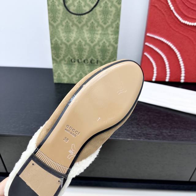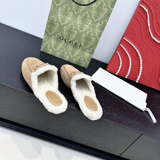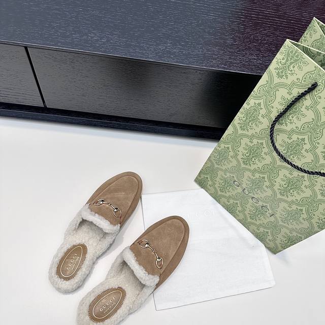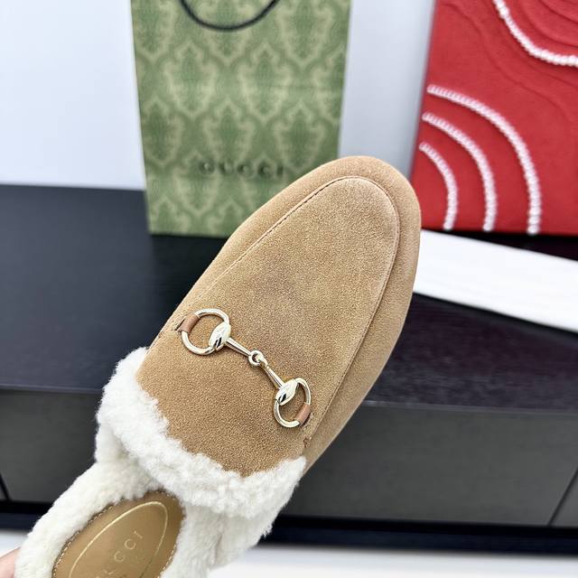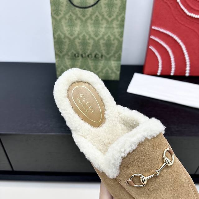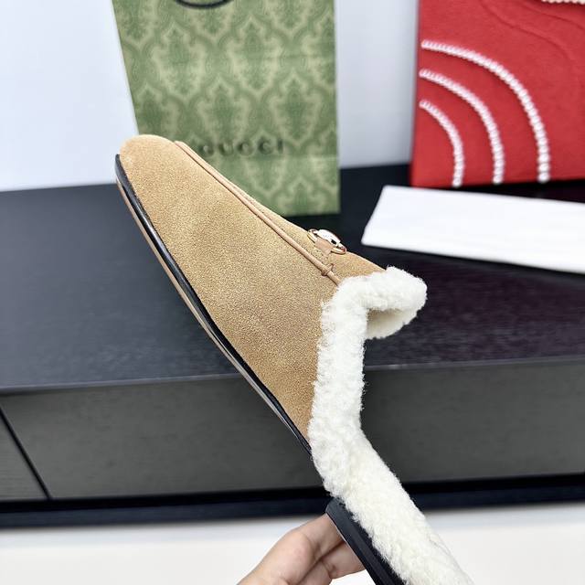 Gucci古奇25年秋冬新款羊毛穆勒半拖拖鞋 这双穆勒拖自带松弛氛围,经典金属扣点缀出精致感,鞋口的毛绒边正好适配微凉天气~踩上脚是裹住脚踝的软和,搭配通勤装或