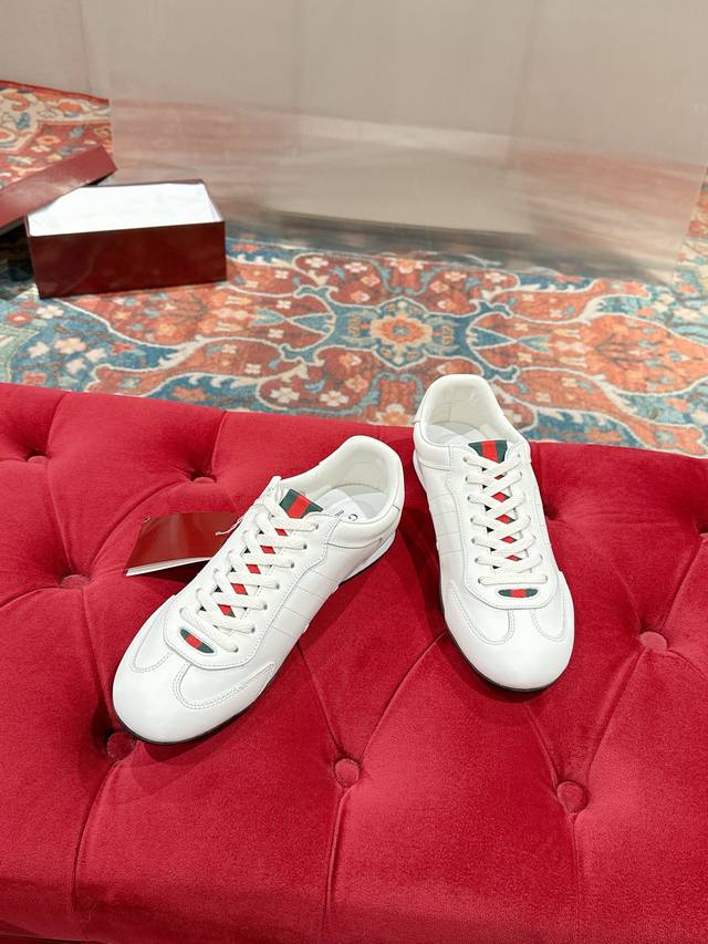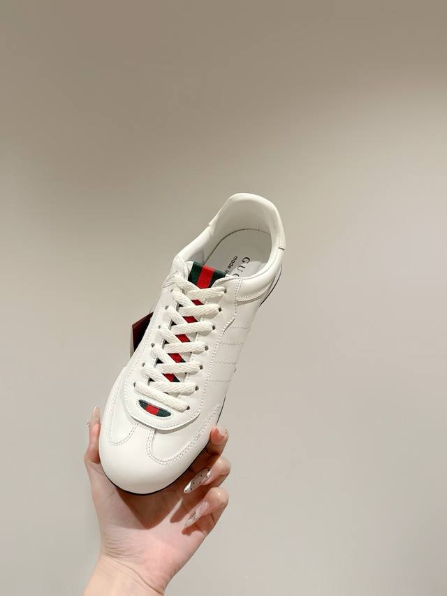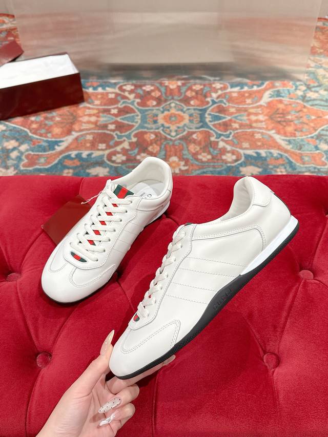 Gucci古驰Shift系列 情侣款 复古 德训鞋 休闲 运动鞋 Ddd 原版购入开发 做货 Gucci Shift系列全新上市,轻盈设计焕新诠释运动风尚。利落廓形更添自在本色,行动间彰显精致质感。织带细节宛如一道延绵不绝的饰带贯穿于整个设计,侧边缝线细节增添点睛之笔Size: 男39-44 45 定制不退换 DDD