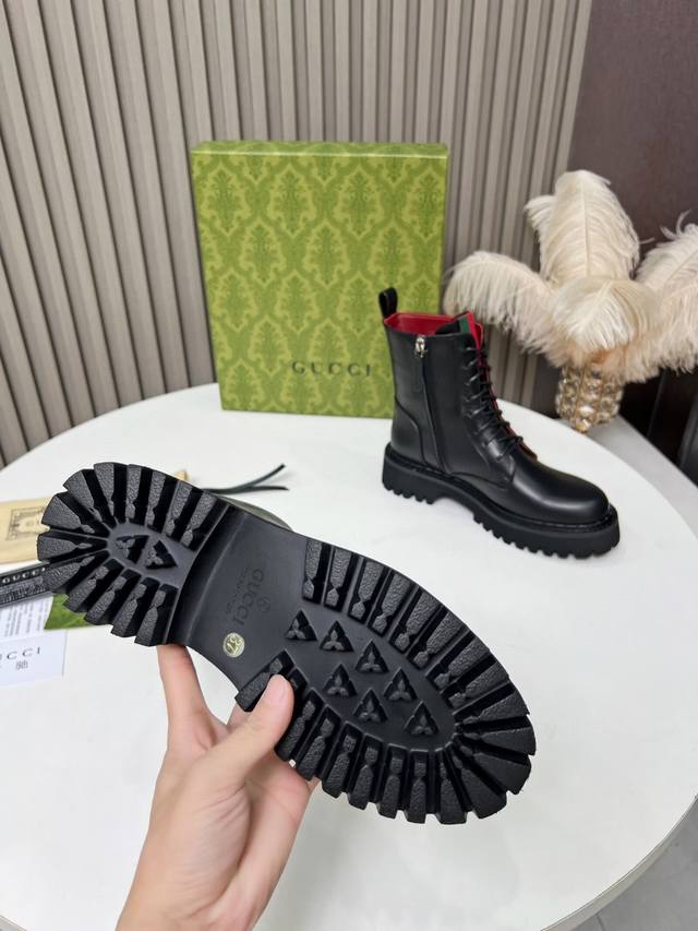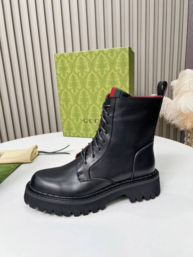 / Gucci女士马衔扣靴子 典藏图案继续在Gucci全新系列中大放异彩。全新系列匠心呈献马衔扣配件,彰显品牌马术传承。这款女士靴子采用皮革制作,搭配橡胶沟纹鞋底。