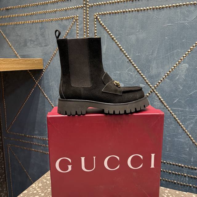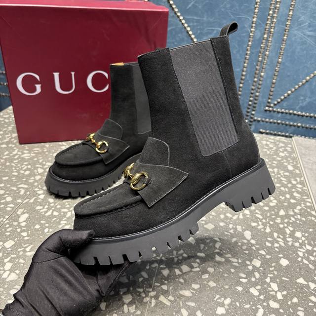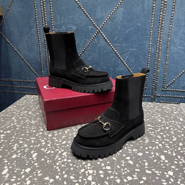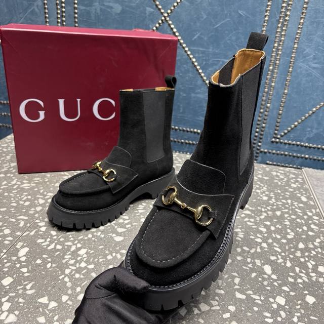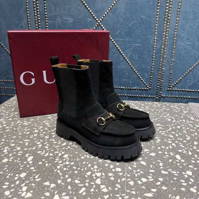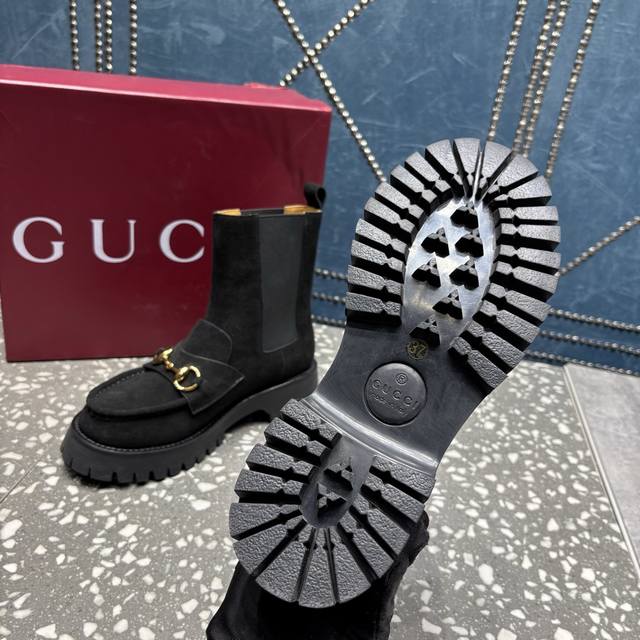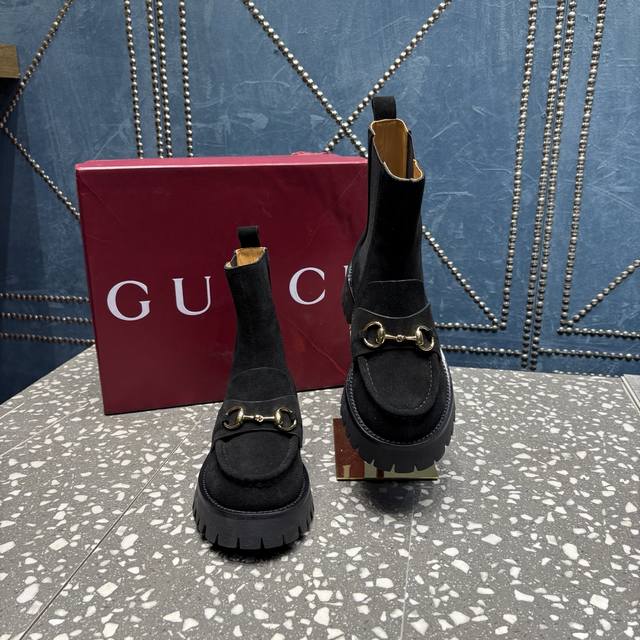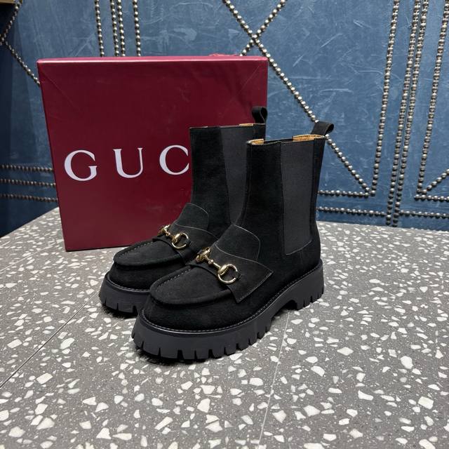 / Gucci 古奇马衔扣厚底短靴 超酷的款式,适合前卫的流行时尚人士 鞋面:丝光牛京皮+马衔扣 内里 垫脚:丝绸牛皮里 靴筒高度:6.5寸 大底:防滑橡胶大+真皮