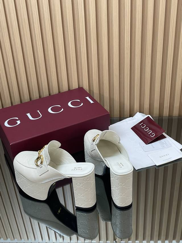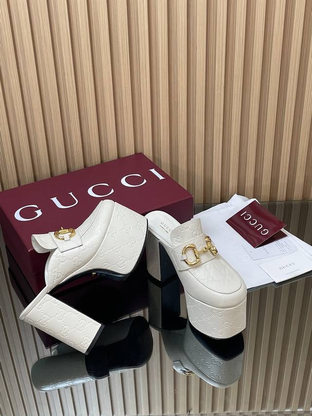 Gucci 古奇2025秋季新品压花皮G G 条纹印刷防水台马鞍扣 马衔扣 厚底穆勒鞋恨天高乐福拖鞋 高跟厚底防水台单鞋,鞋柜必备款 原版套楦 高端品质 DDD Gucci全新系列匠心呈献马衔扣配件,彰显品牌马术传承。这款女士穆勒鞋采用厚底高跟设计,打造稳固而舒适的穿着体验,浅金色调配件 重工艺匠心制作,鞋面皮包裹Abs后跟+ pu水台,全手工处理 DDD 面料:进口小牛皮 原版1:1定制五金 DDD 内里: 羊皮垫脚 DDD 大底:意大利真皮大底 DDD 跟高:后高跟10.5 Cm DDD 前防水台:5
