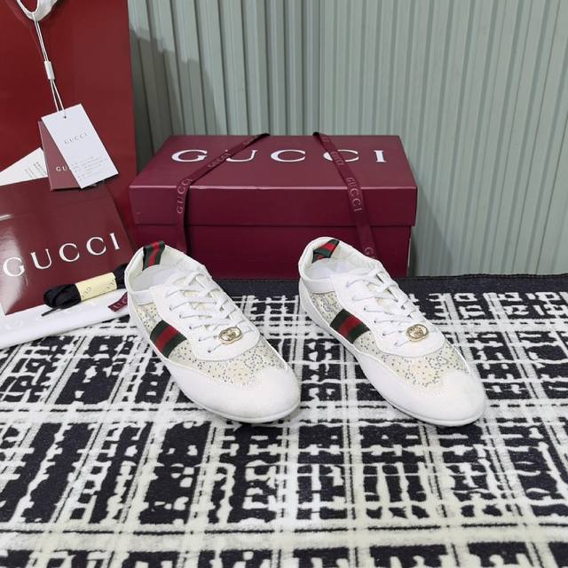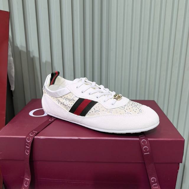 Gucci 古驰新款德训薄底 运动鞋 DDD 轻盈设计焕新诠释运动风尚。利落廓形更添自在本色,行动间彰显精致质感。织带细节宛如一道延绵不绝的饰带贯穿于整个设计,侧边缝线细节增添点睛之笔。 DDD 原版一比一开发 麂皮拼接原版开模鞋面 原版开模大底 Size:35-39 40定做不退换 DDD