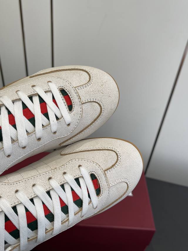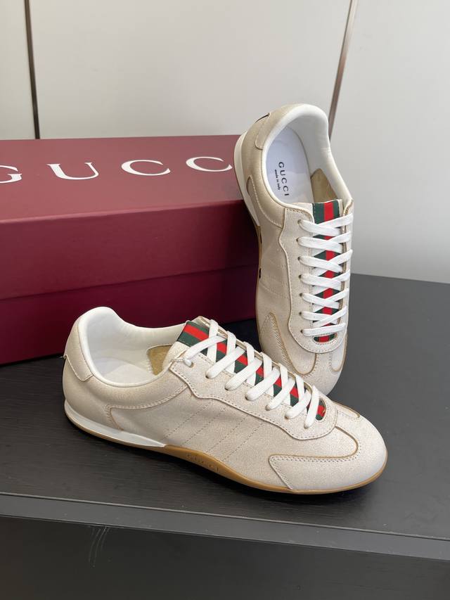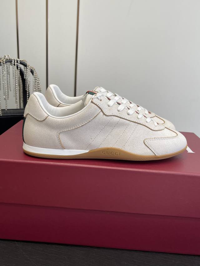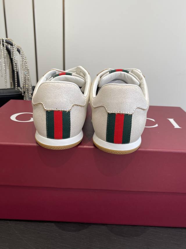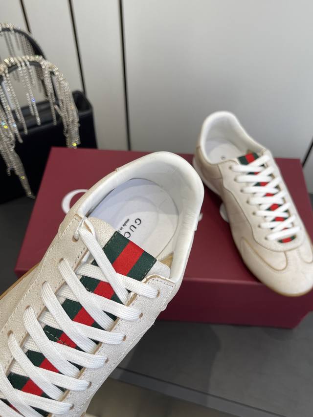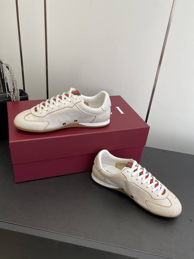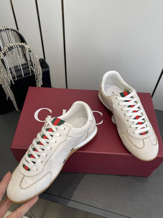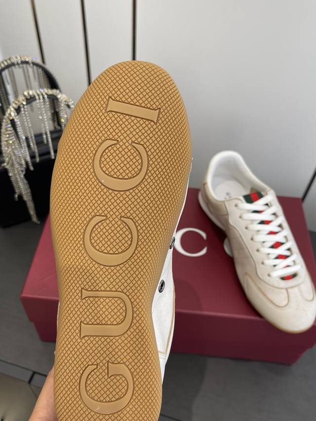 Gucci 古驰 Shift系列 情侣款 复古 德训鞋 休闲 运动鞋 DDD Gucci Shift系列全新上市,轻盈设计焕新诠释运动风尚。利落廓形更添自在本色,行动间彰显精致质感。织带细节宛如一道延绵不绝的饰带贯穿于整个设计,侧边缝线细节增添点睛之笔 DDD 面料: 原版定制进口头层牛皮 DDD 内里: 原版定制柔软羊皮里 DDD 大底: 原版开模防滑Tpu材质 DDD 底厚: 2Cm DDD 码数:男款:39-45 DDD