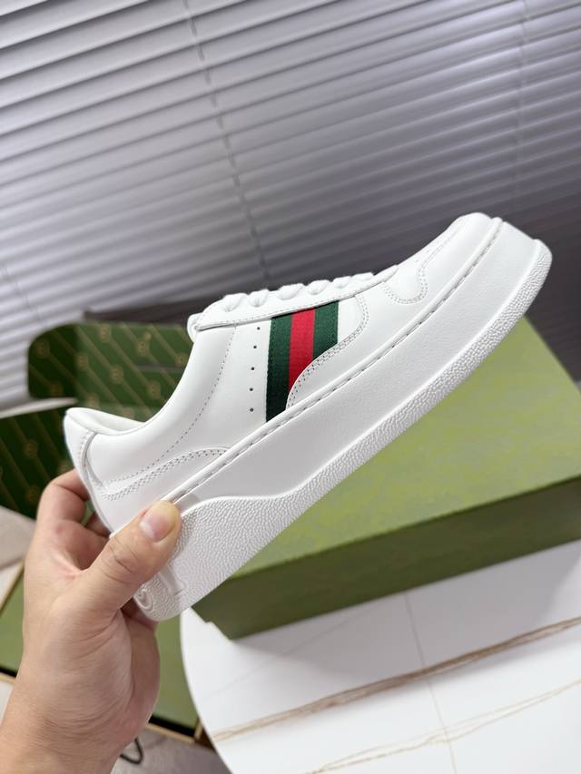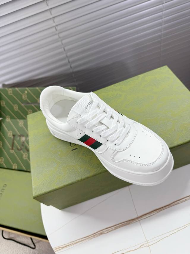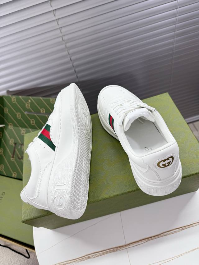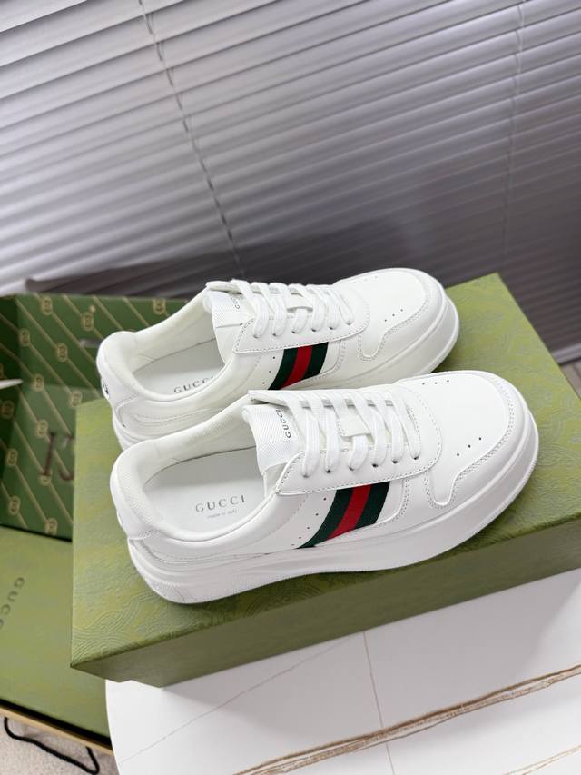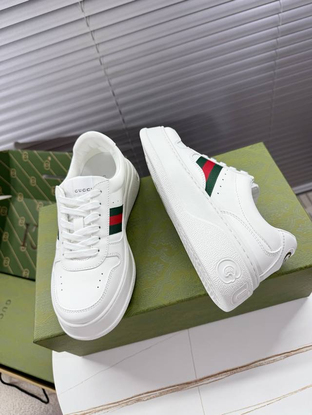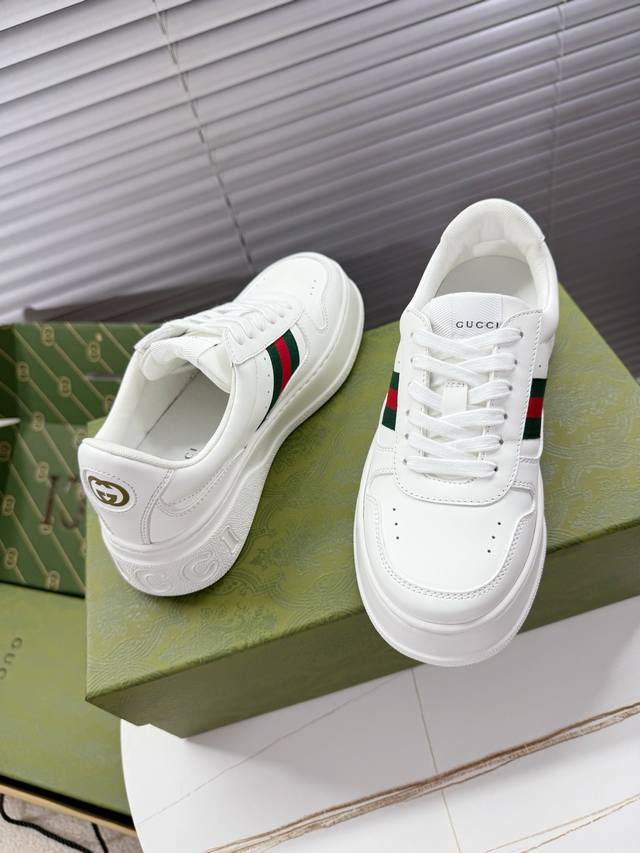 Gucci 情侣款饼干鞋 厚底鞋 小白鞋 运动鞋 平板鞋 走秀款:明星 网红 小红书等必定种草打Call 原版定制牛皮面料 经典老花布,穿孔,压纹工艺 ,原版底有大Gucci Logo,后跟还有个Gg Logo,5Cm增高厚底,经典Gucci织带 女款35 40正码 男款39 44正码