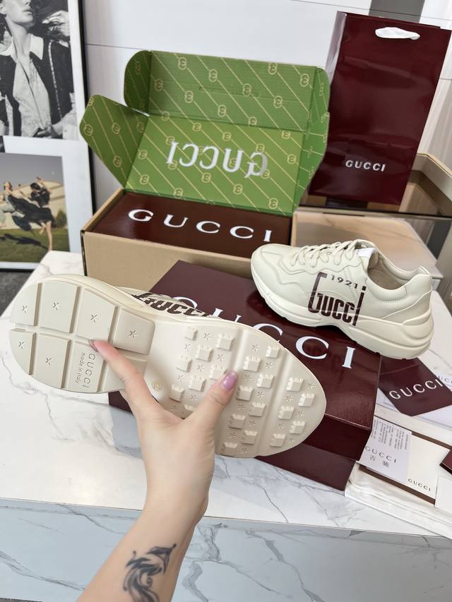 g家最新爆款厚底小白鞋运动与休闲混搭设计既有潮流的理念又有复古风的气息。全新系列继续从其他时代的日常生活中寻找灵感,并融入当下的设计精髓Gg 印花压纹皮革制作,