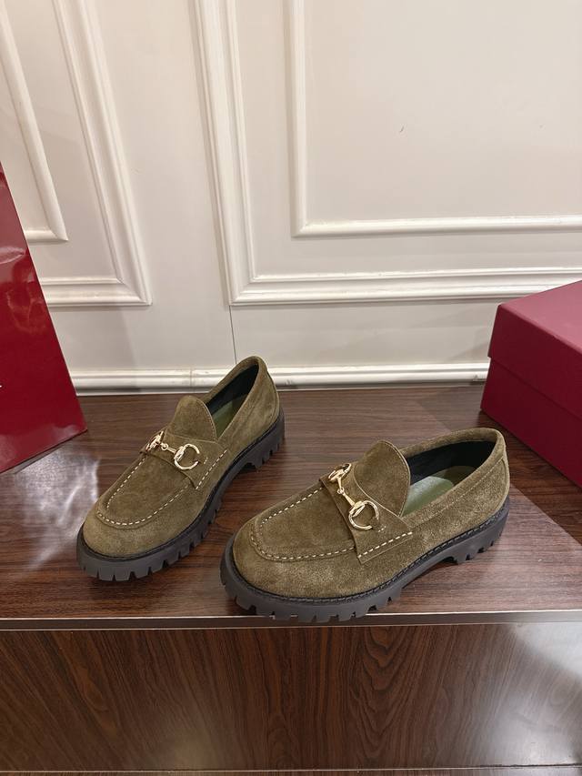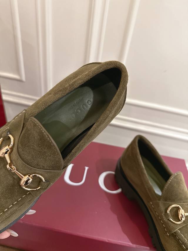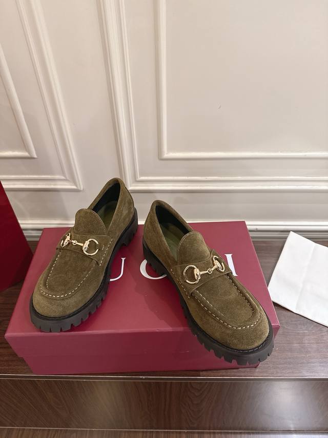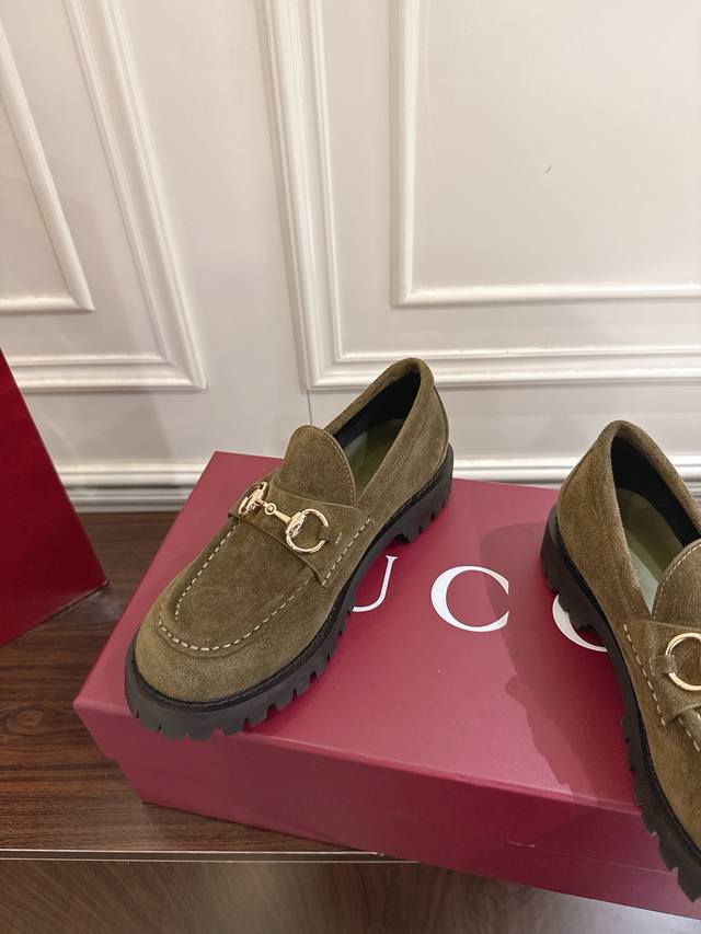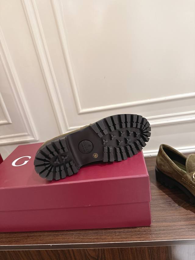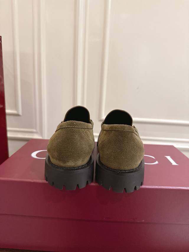 Gucci 饰马衔扣沟纹底乐福鞋 作为品牌对马术本源的致敬之作,马衔扣历经岁月洗礼之后,将厚重历史底蕴和现代时尚流行融合形成一体 牛皮面 底厚5Cm 码数36~40 35.41.42定做不退换