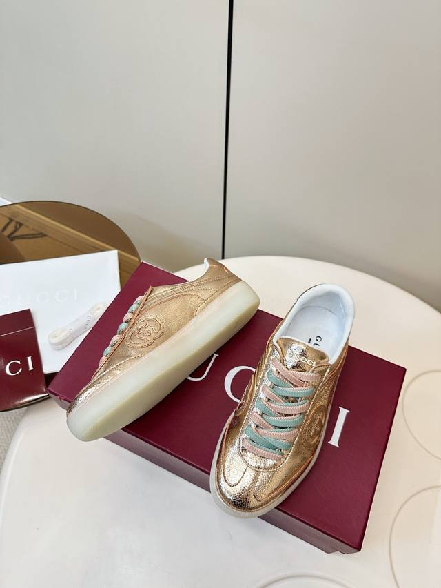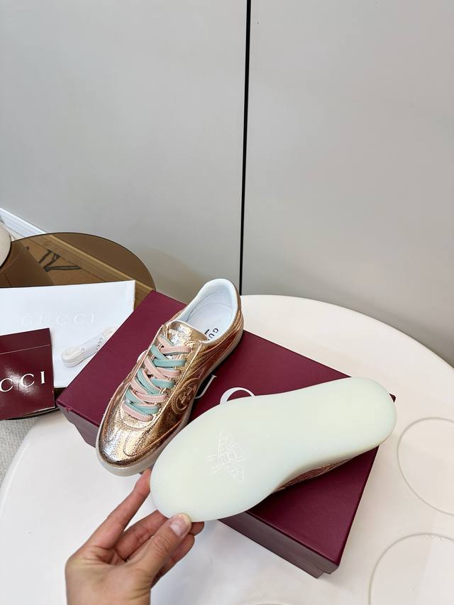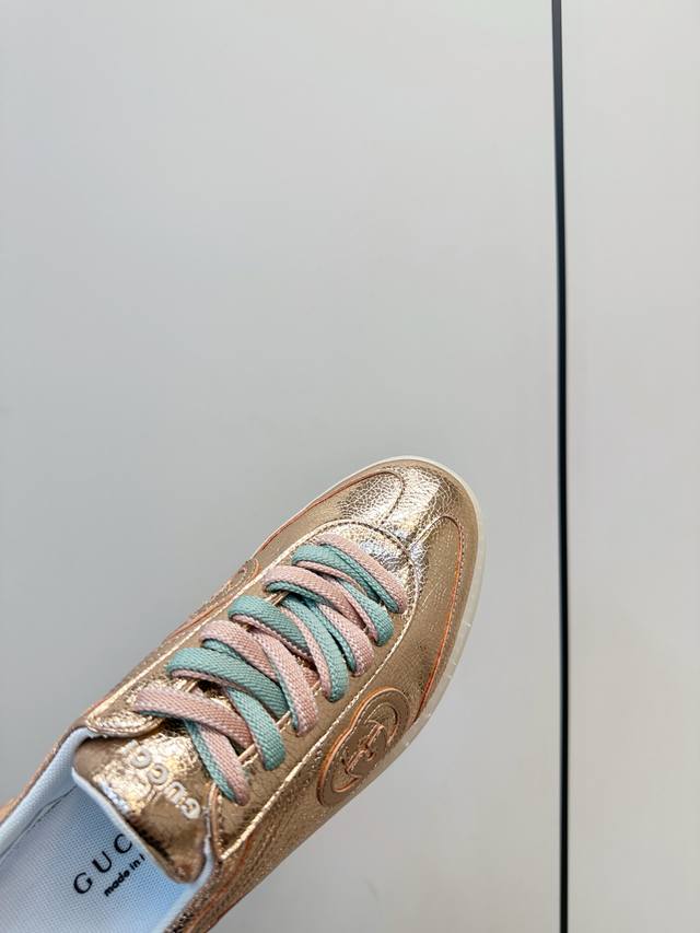 Gucci G75金属光泽休闲运动板鞋 Gucci G75系列运动鞋,金属光泽牛皮+双色鞋带,时尚感满分!鞋面有经典双G压纹,细节精致,品牌辨识度超高。 白色橡