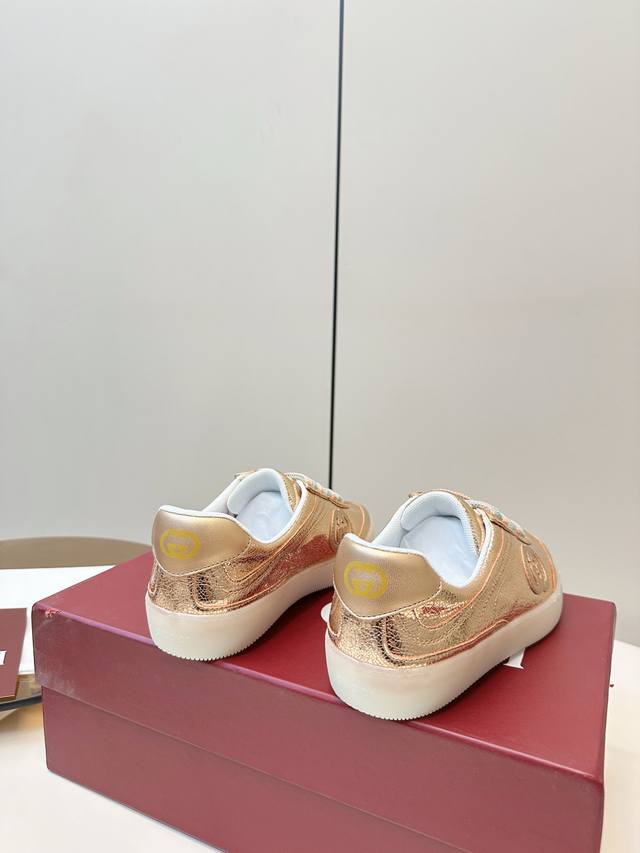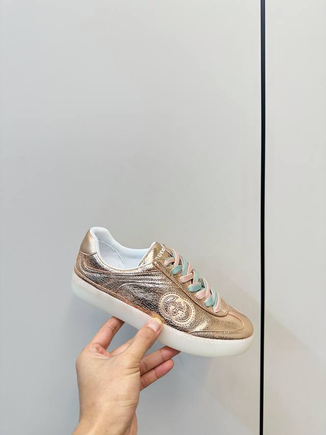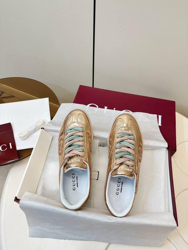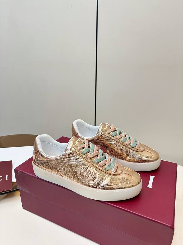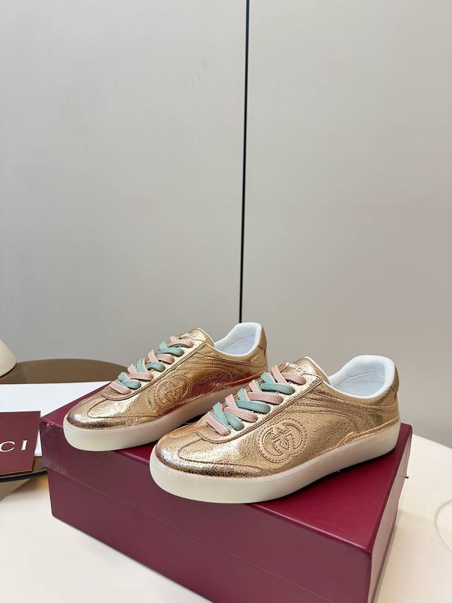 Gucci G75金属光泽休闲运动板鞋 DDD Gucci G75系列运动鞋,金属光泽牛皮+双色鞋带,时尚感满分!鞋面有经典双G压纹,细节精致,品牌辨识度超高。 DDD 白色橡胶鞋底,舒适又耐磨,日常通勤或休闲都能轻松驾驭。金银配色+多彩鞋带,优雅又活力,搭配西装裤或丝绒裙都很出彩,是实用与设计感兼具的高端运动鞋 DDD 面料:金属牛皮面! DDD 内里绵羊皮 DDD 码数35-40 40.41订做 DDD