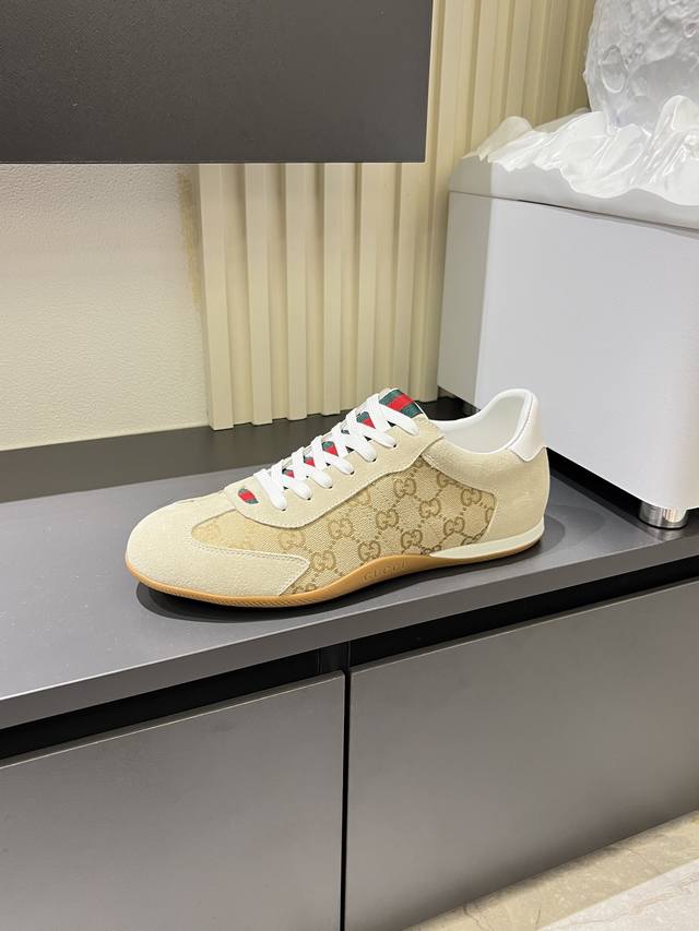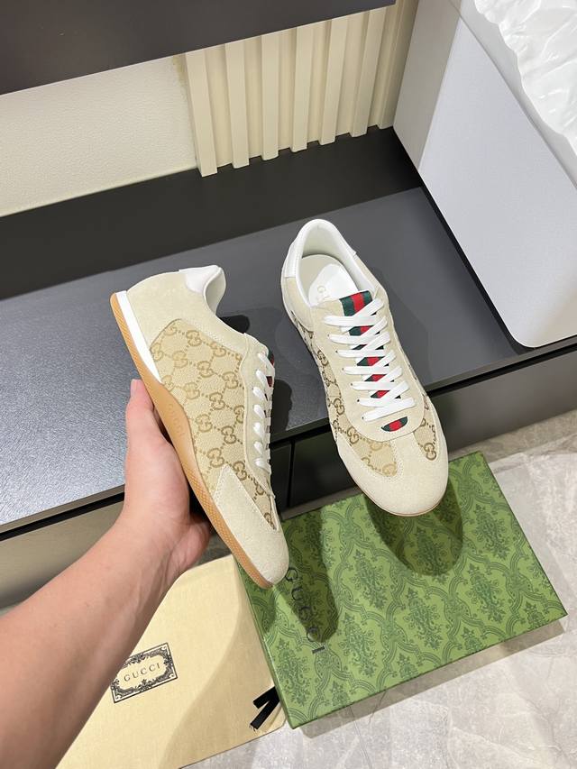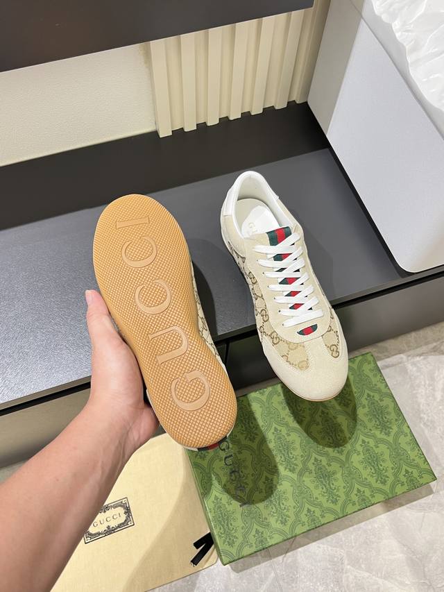 Gucci Shift系列运动鞋,主打轻盈薄底设计,麂皮+帆布+科技面料拼接,质感满分!鞋舌和后跟有红绿织带,辨识度超高。经典棕色+米白配色,复古又摩登,贝壳头鞋型显脚小,日常穿搭或裙装裤装都很出彩~鞋面织物+弹性后跟,穿脱方便,包裹感舒适,通勤休闲都能驾驭,是Demna Gvasalia入主后超火单品之一。Size:38-45! DDD